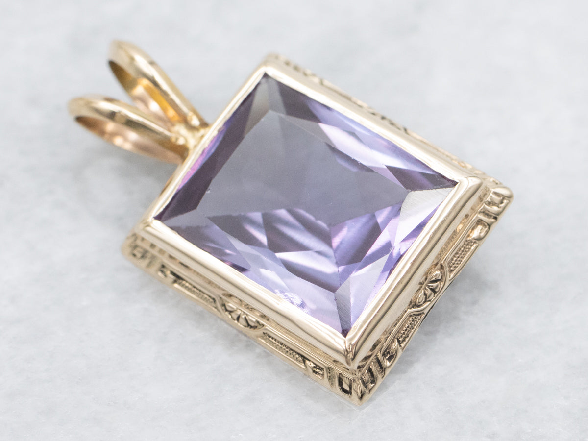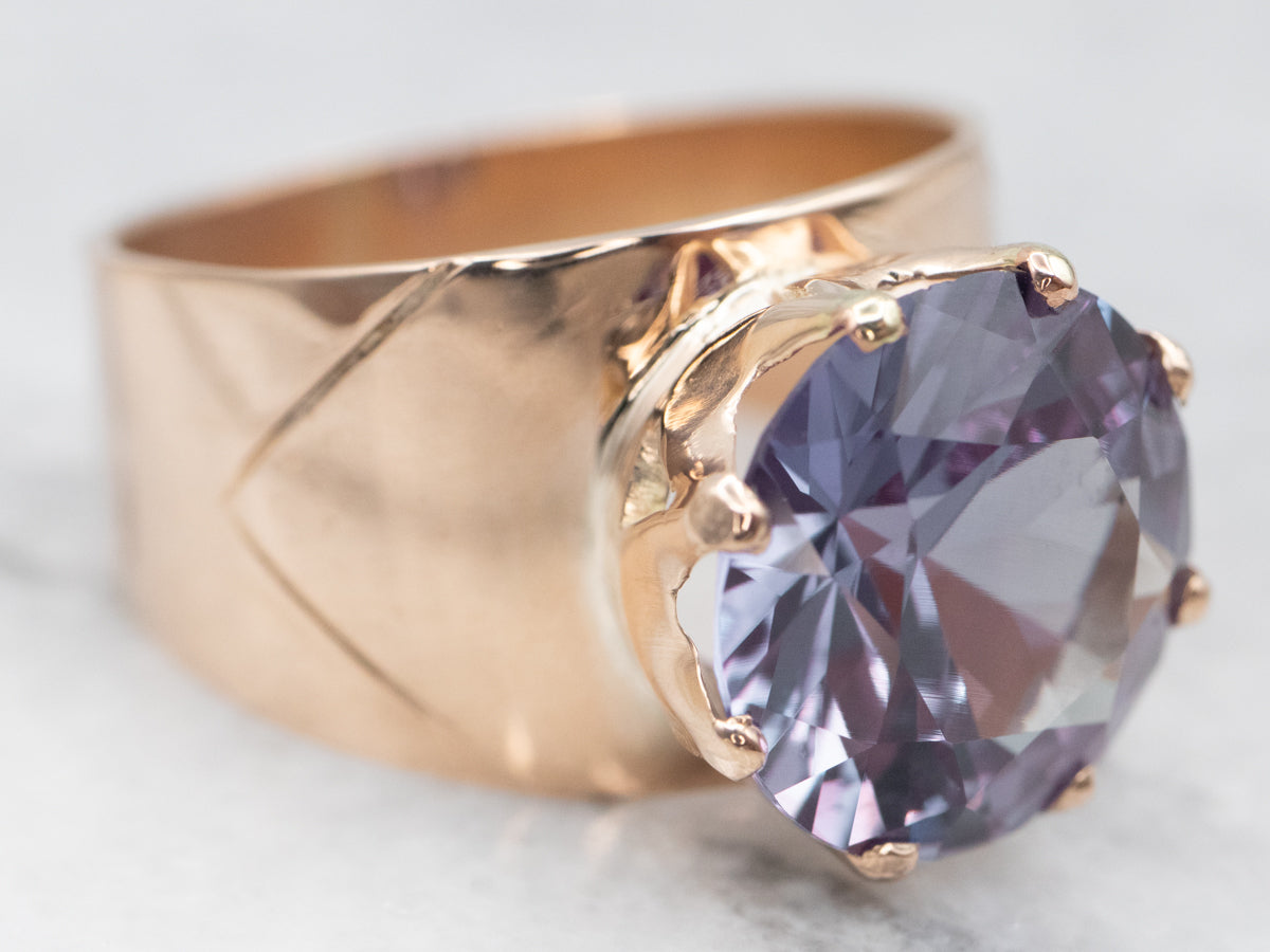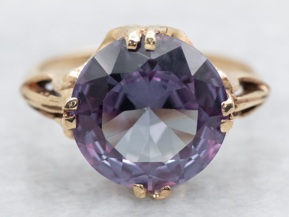 The synthetic alexandrite stones within our collection date back to the 1950s when synthetic corundum was produced to imitate synthetic alexandrite. In the vintage and estate industry, these synthetic corundum (synthetic sapphire) gemstones from this period are almost always referred to as synthetic alexandrite, even though they are chemically synthetic corundum. The chemical properties of this stone are synthetic corundum, but the trade name is synthetic alexandrite.