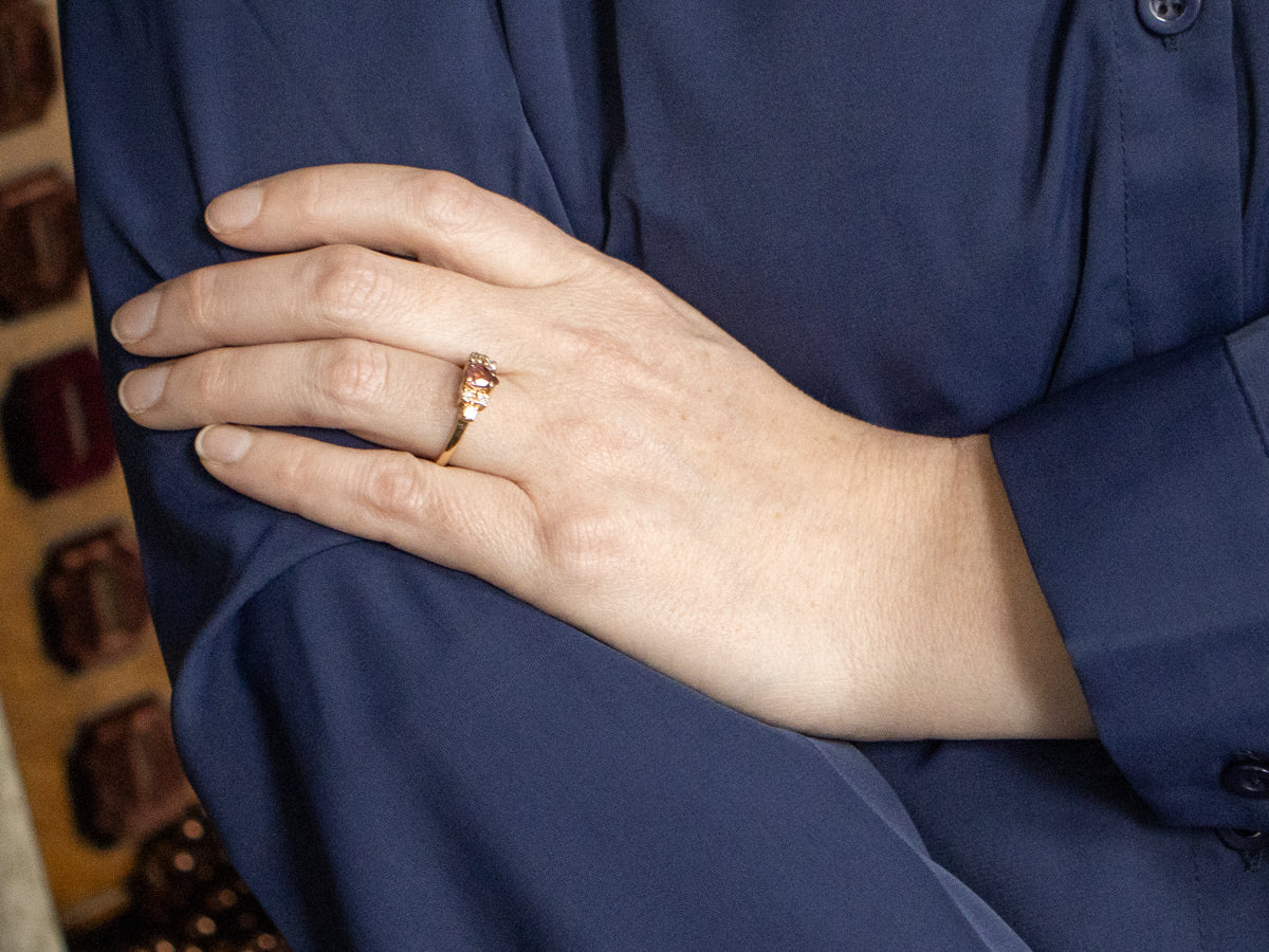 This sleek ring features two sparkling diamonds, in beautifully polished 14-karat yellow gold! The center stone has a sweetly hued strawberry wine pink tourmaline, in a lovely pear cut. A wonderful, versatile piece, perfect for a birthstone or anniversary or as a little gift for one's self!