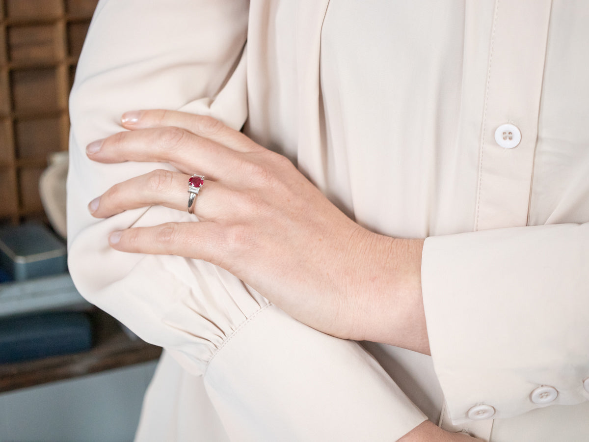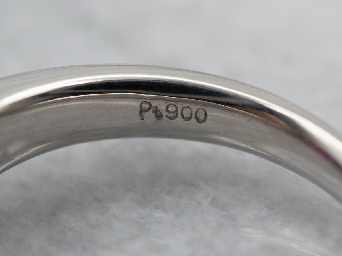 Vibrant in color, flashes of raspberry create a stunning display in this ruby. Accent diamonds add sparkle and light, complimented by a simple band crafted of weighty platinum.