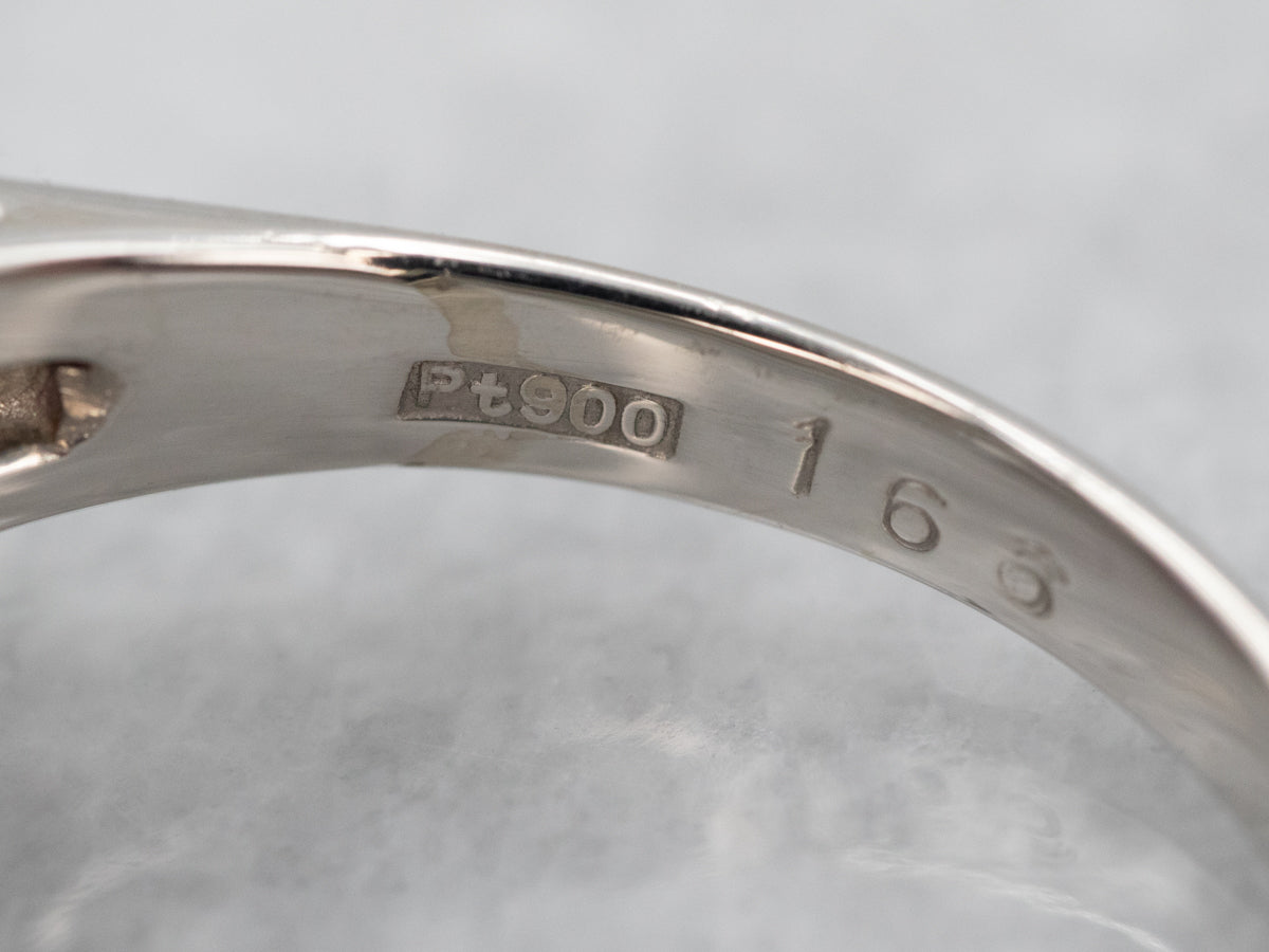 Metal: Platinum Gem: Ruby 1.66 Carats Gem Measurements: 7.2 x 7.8 mm, Oval Accents: Round and Baguette Diamonds totaling .53 Carats, SI in Clarity, G in Color Ring Size: 6.25 Marks: "[PT900]166 053" Stamped on the inside band