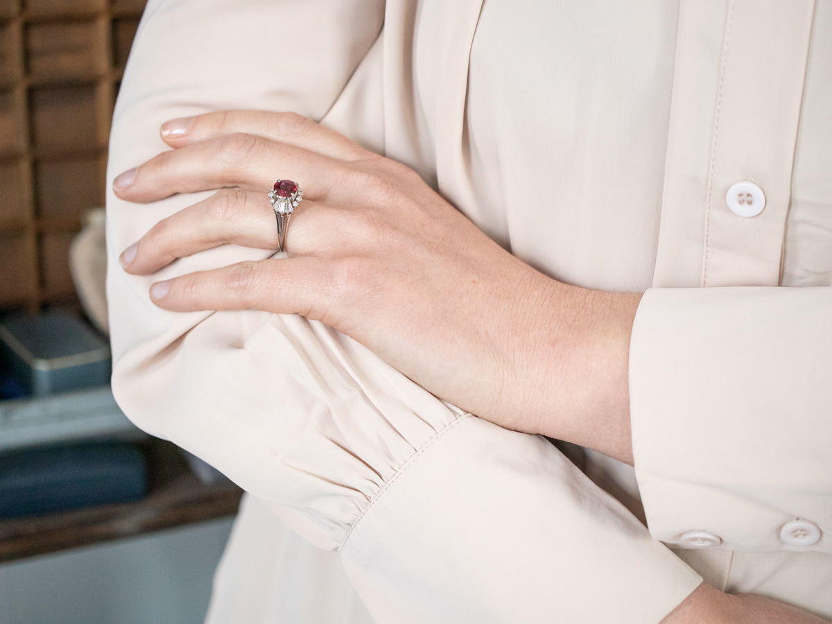 Vibrant in color, flashes of raspberry create a stunning display in this ruby. A diamond halo adds sparkle and light, complimented by a simple band crafted of weighty platinum.