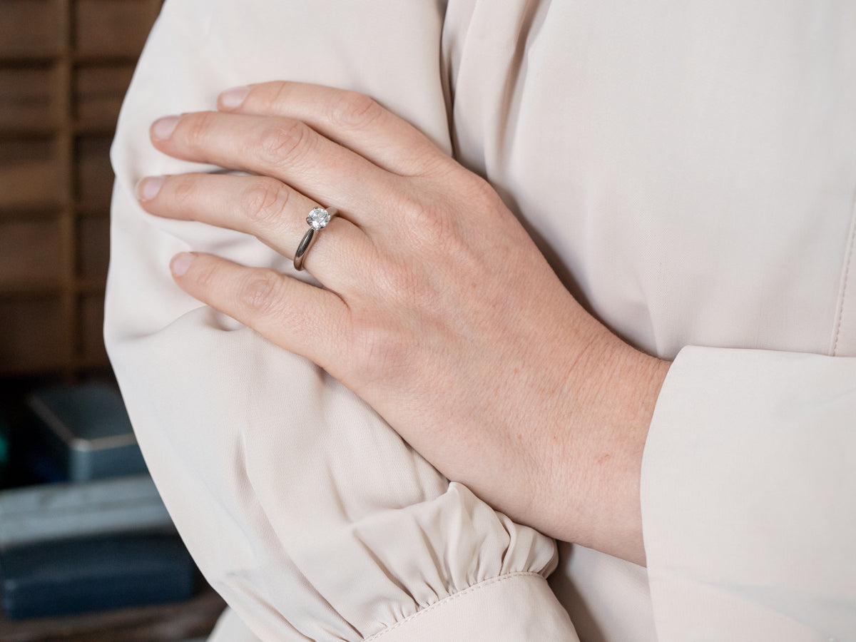 This round brilliant diamond engagement ring really stands out! It has a nice presence on the finger, is not too high, comfortable, and easy to wear. The bright diamond is set into a traditional, secure white 18-karat gold Jabel mounting, supported and framed by tapered shoulders. Utter simplicity, the focus of this ring is truly the incredible, bright diamond center!