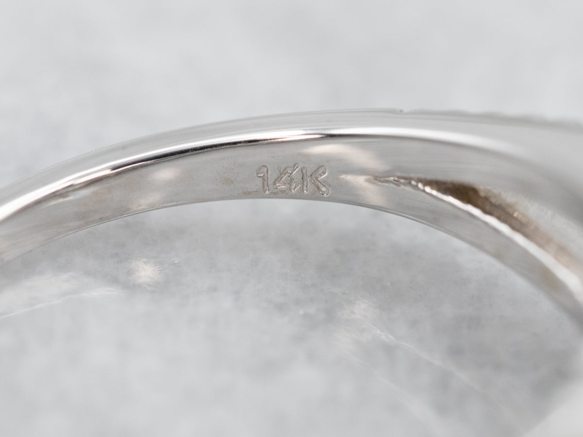 Metal: 14K White Gold Gem: Blue Zircon 4.55 Carats Gem Measurements: 9.5 mm, Round Accents: 48 Diamonds totaling .28 Carats, H-I in Color, SI-I in Clarity Ring Size: 6.50 Marks: "(*) 14K" Stamped on the inside band