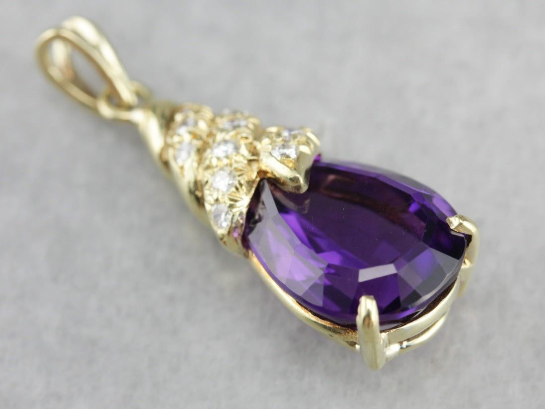 We love this modern amethyst piece, crafted in the mid-1990's this piece features a beautiful cut amethyst accented perfectly by the polished yellow gold mounting glitter with diamond, ready to wear or gift this is the perfect piece to transition from office to date night!