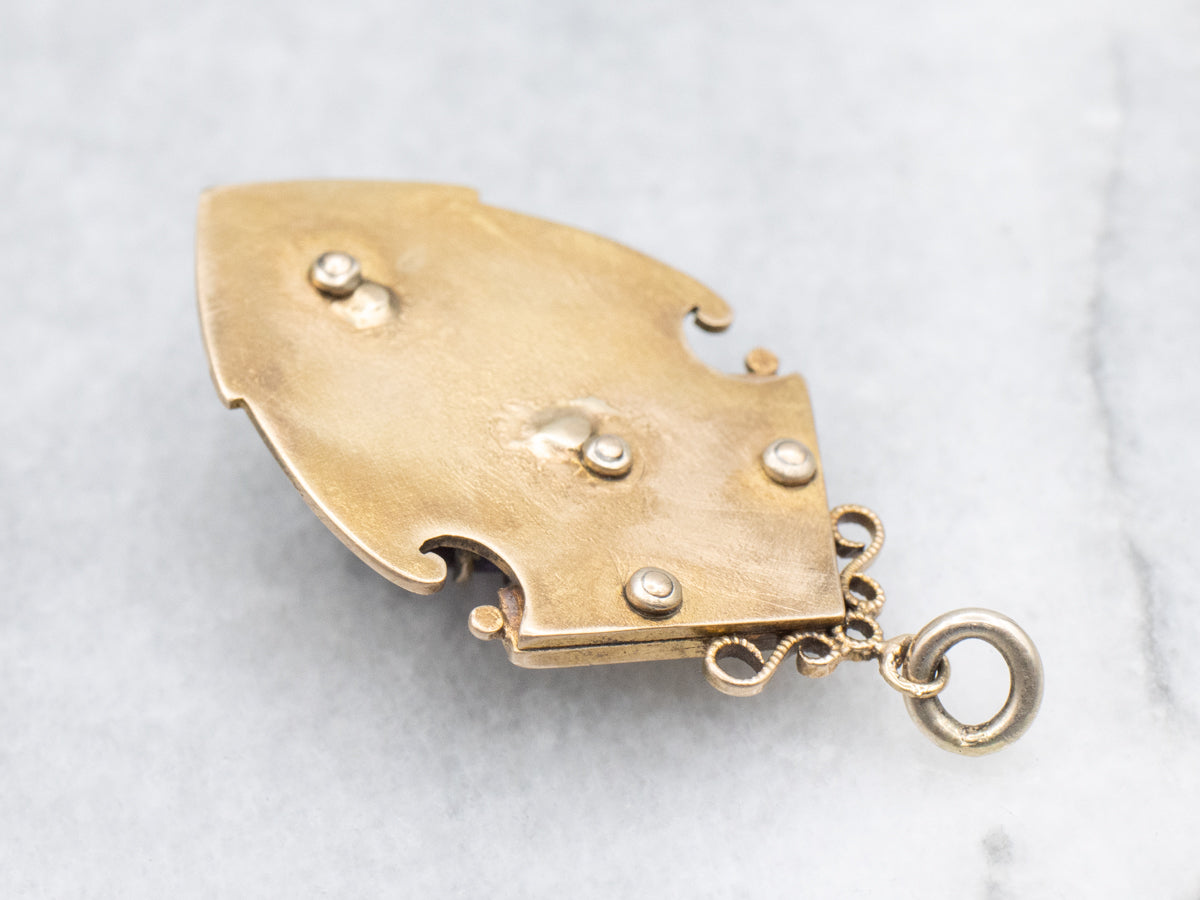 Metal: 14K Antique Yellow and Rose Gold Gem: Amethyst Gem Measurements: 8.2 x 11.4 mm, Oval Cut Accents: Rose Cut Diamond .02 Carats, H in Color, SI2 in Clarity Measurements: 19 x 37 mm, with bail