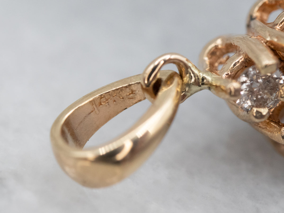 Metal: 14K Yellow Gold Gem: Amethyst 2.31 Carats Gem Measurements: 8.1 x 10.1 mm, Oval Accents: 3 Diamonds totaling .14 Carats, SI in Clarity, J-L in Color Measures: 8.1 x 22.3 mm, with bail Marks: "14K" Stamped on the bail