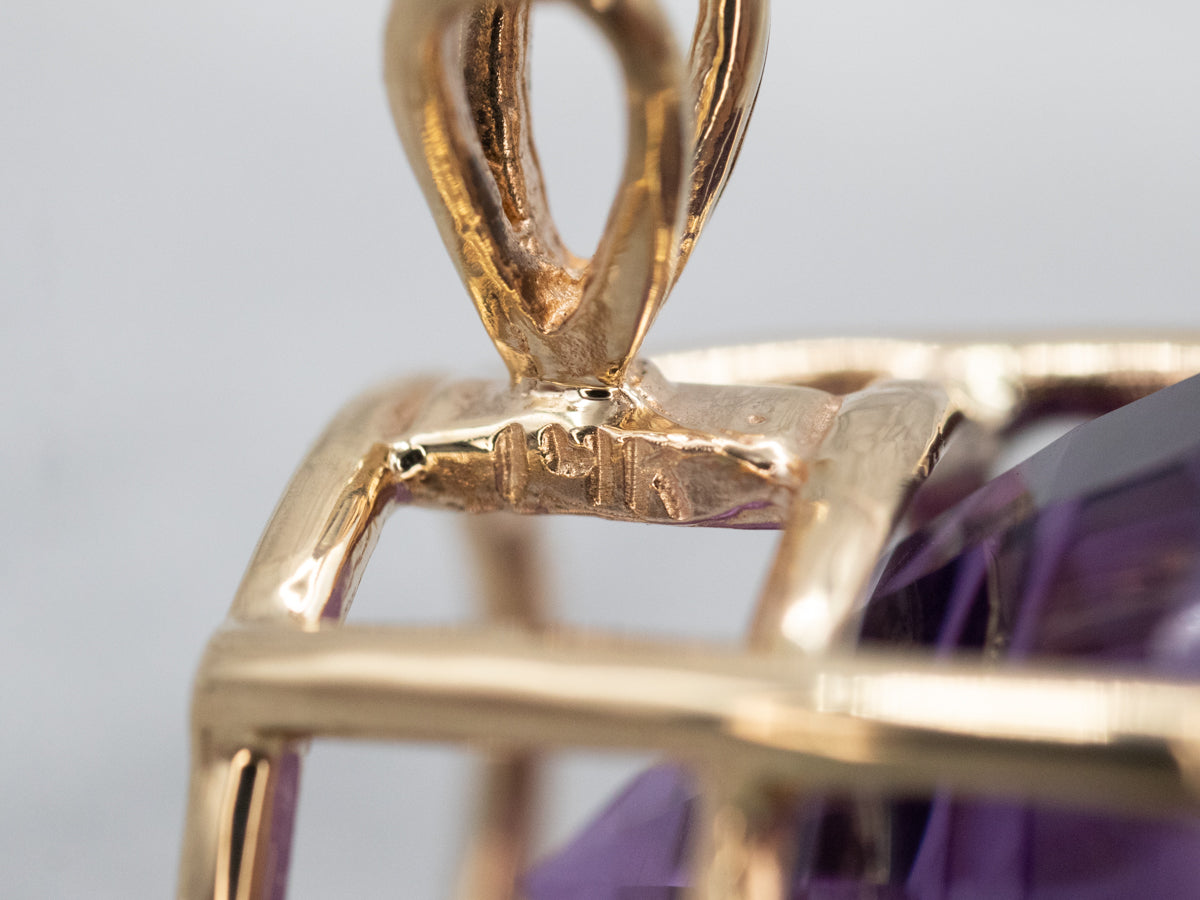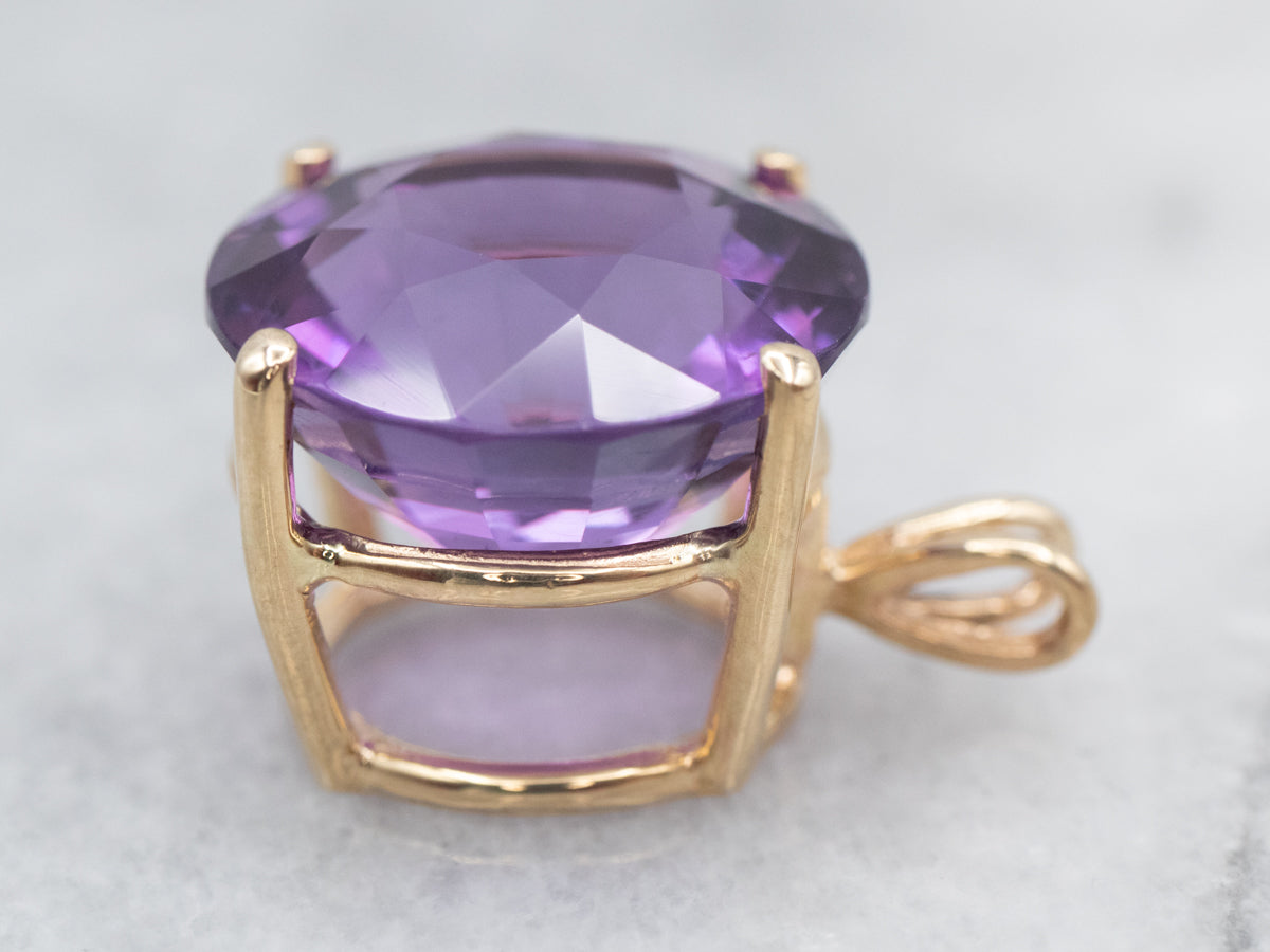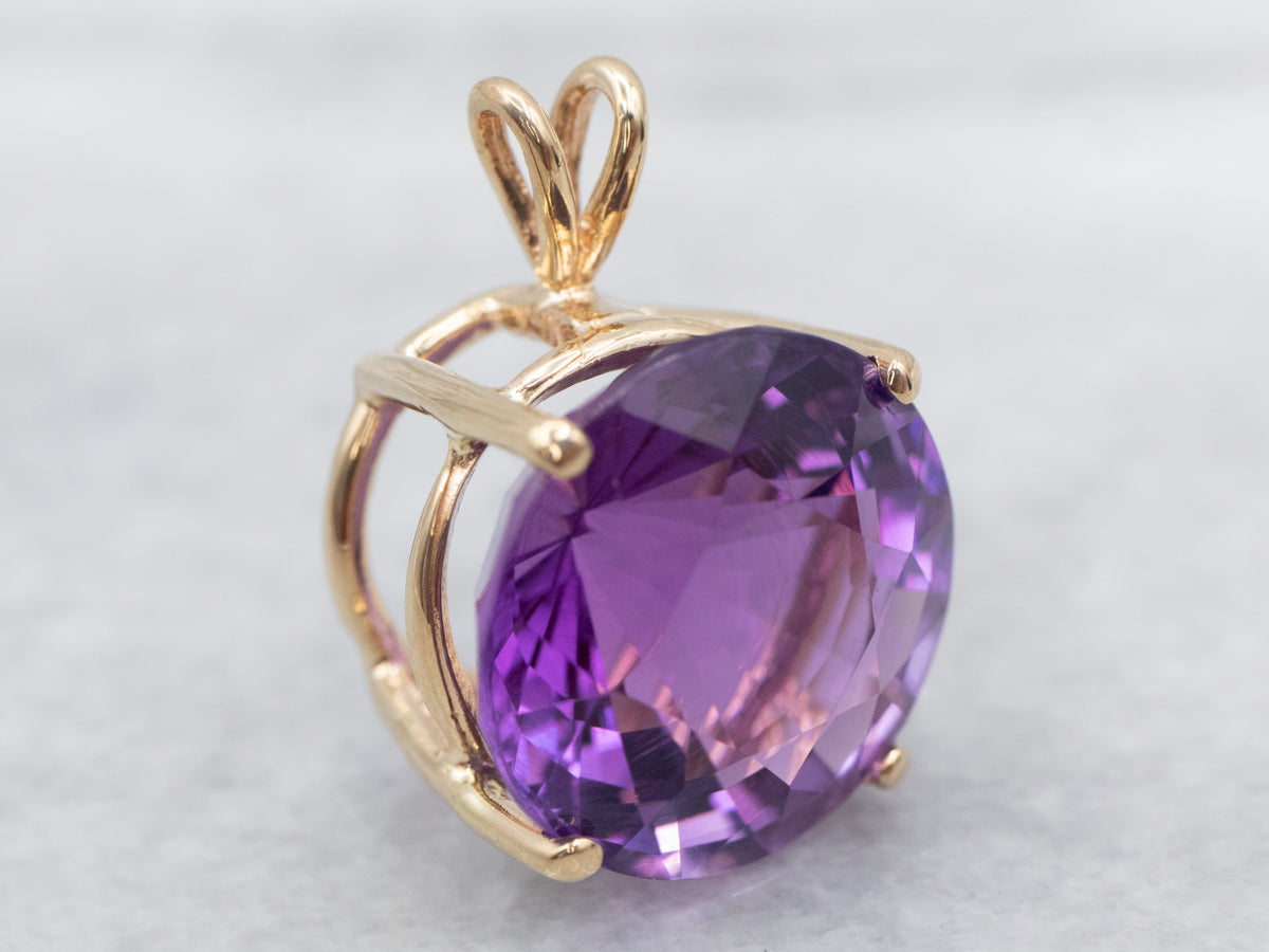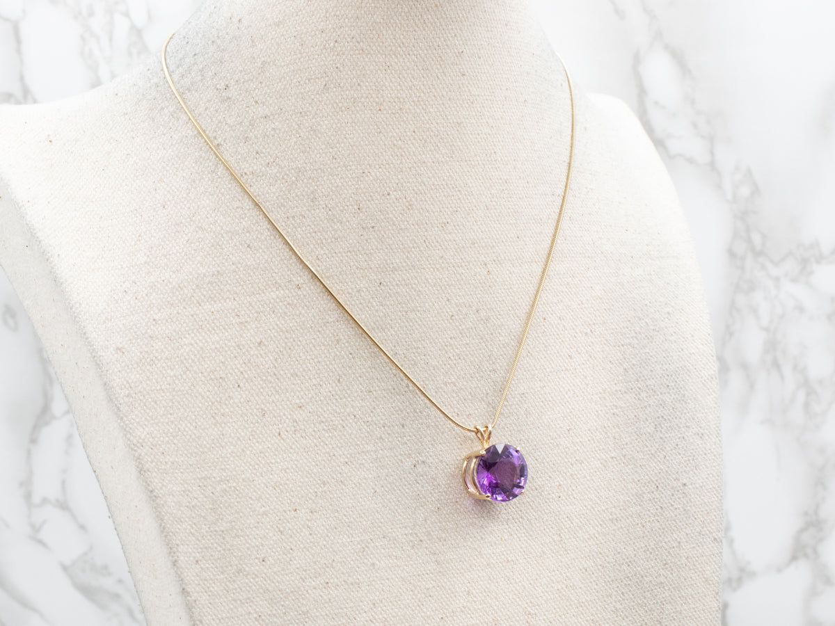 This amethyst gem is bursting with brilliant purple color! The round cut faceting optimizes its luster, and the yellow gold only compliments the stone with its warm hue. This pendant could be worn everyday or for special occasions!
