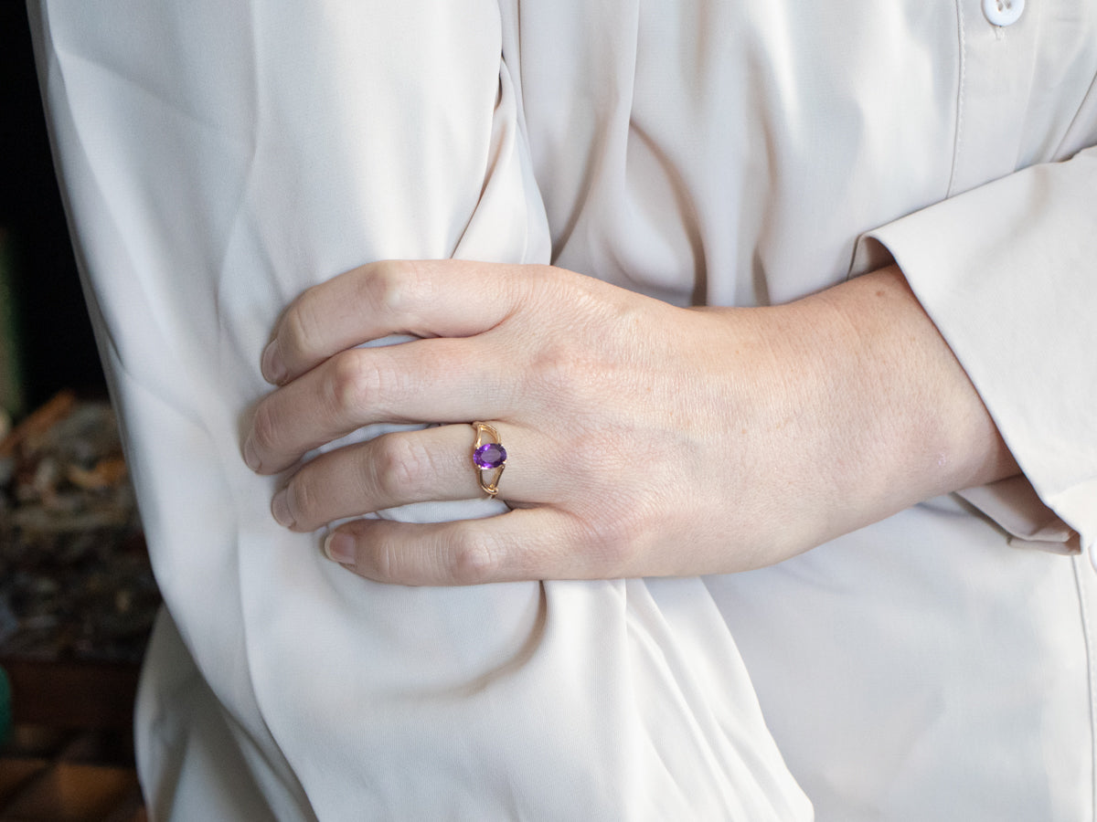 This solitaire ring features a genuine amethyst stone set in a stunning yellow gold band. Its classic style and timeless elegance are sure to add a touch of sophistication to any outfit. Perfect for a special occasion or everyday wear.