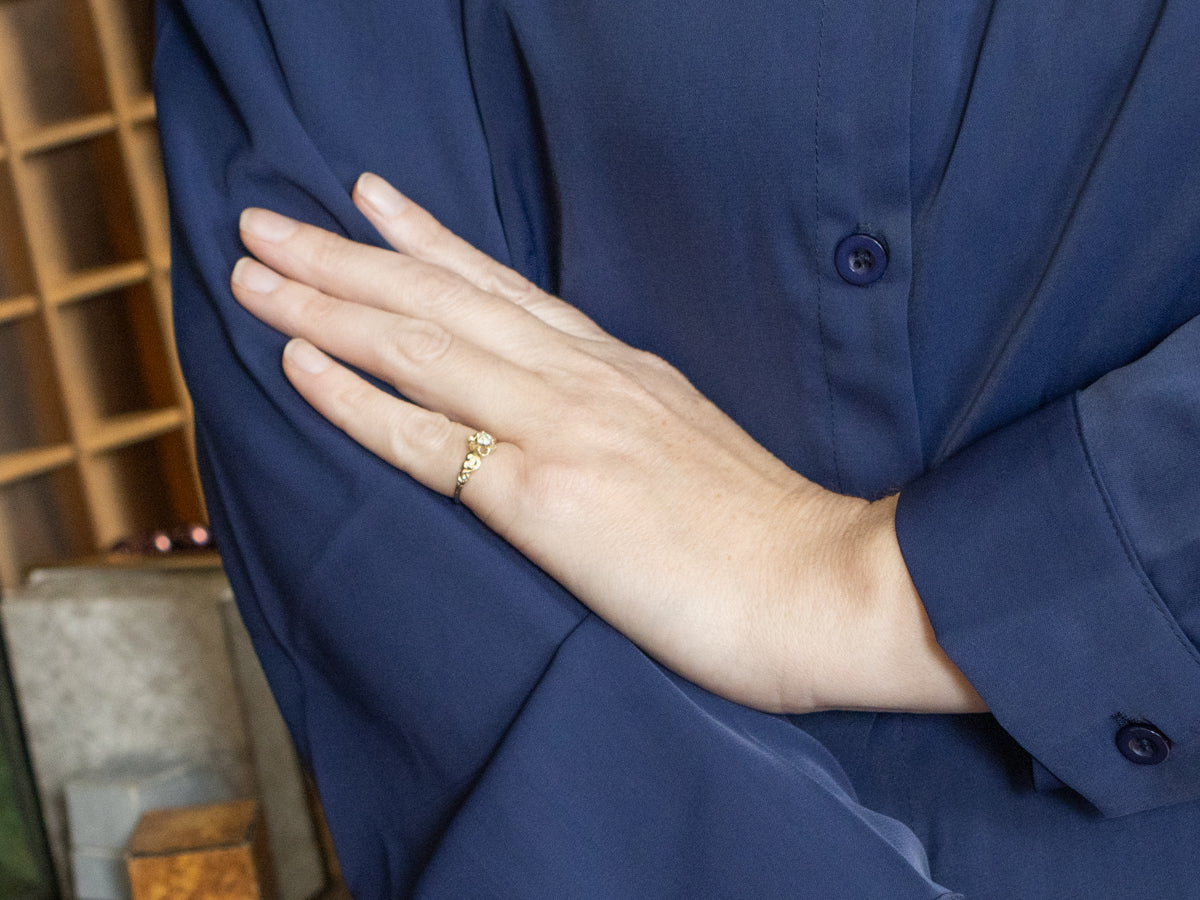 Very romantic! This antique ring features a gold flower, whose sculpted petals protect a bright and sparkling old mine-cut diamond. This ring is the perfect token of love, whether for an anniversary birthstone or as an engagement piece!