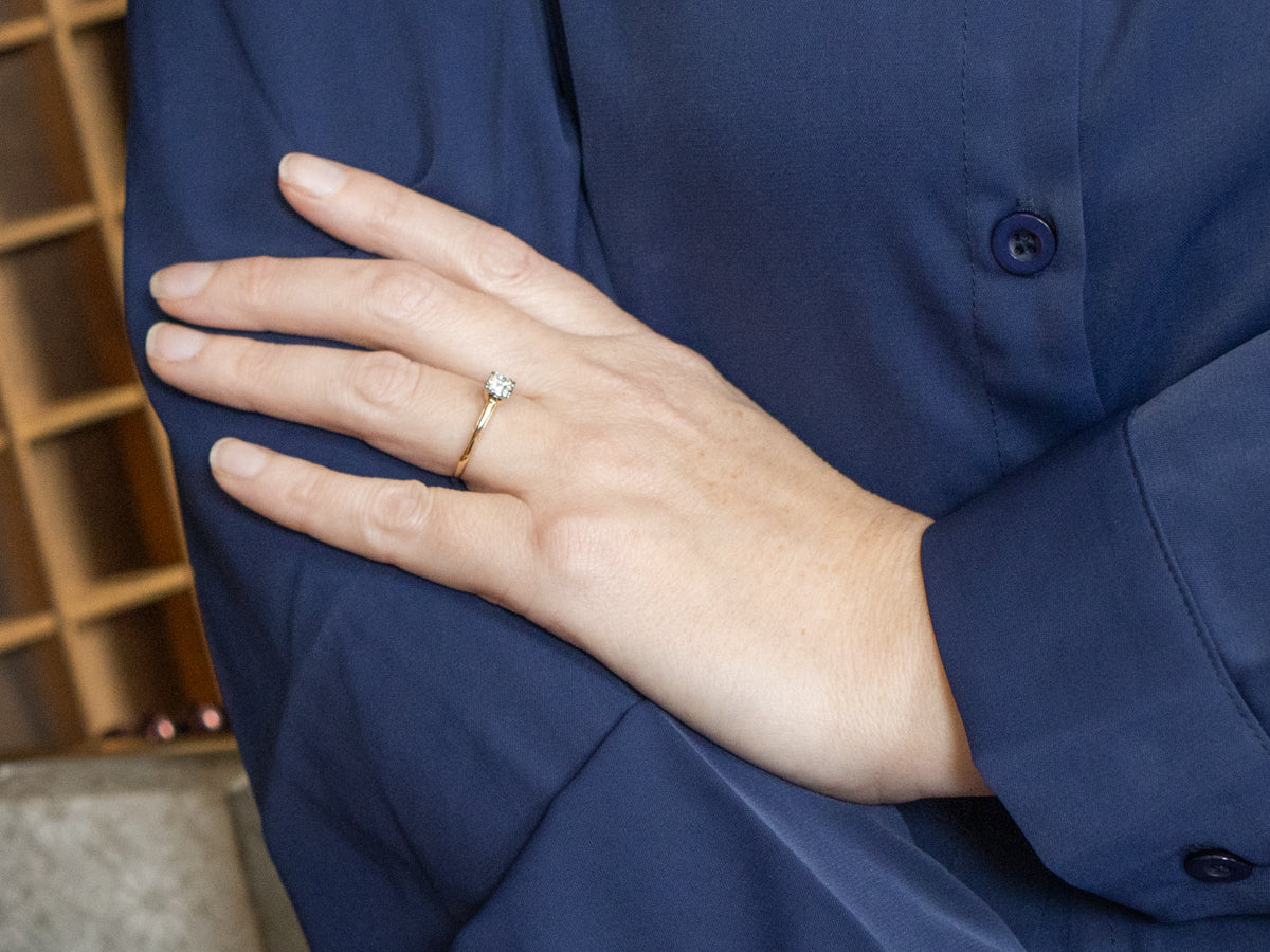 This two-tone 1940s solitaire engagement ring is sure to catch hearts! With a sweet yellow gold band and a charming white gold illusion setting, the European cut diamond shines with a fiery sparkle. Timelessly lovely, this ring is a keepsake to cherish forever.