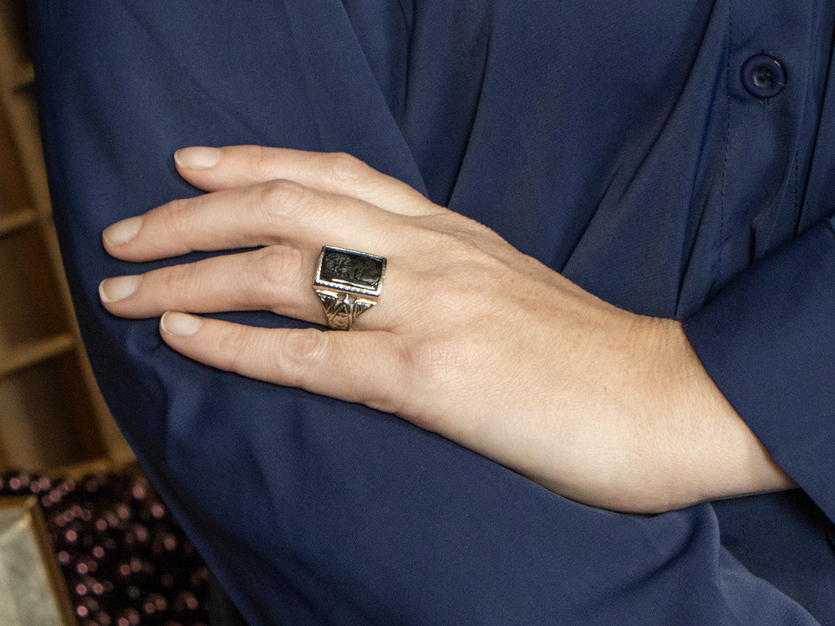 The carving in this sardonyx cameo is perfect and stately! It depicts a Greek man, maybe depicting famed poet and philosopher Plato, with curls done in fine detail, wearing a traditional toga. The deep near black hue of the sardonyx is a wonderful compliment to the hand-engraved Art Deco era mounting.