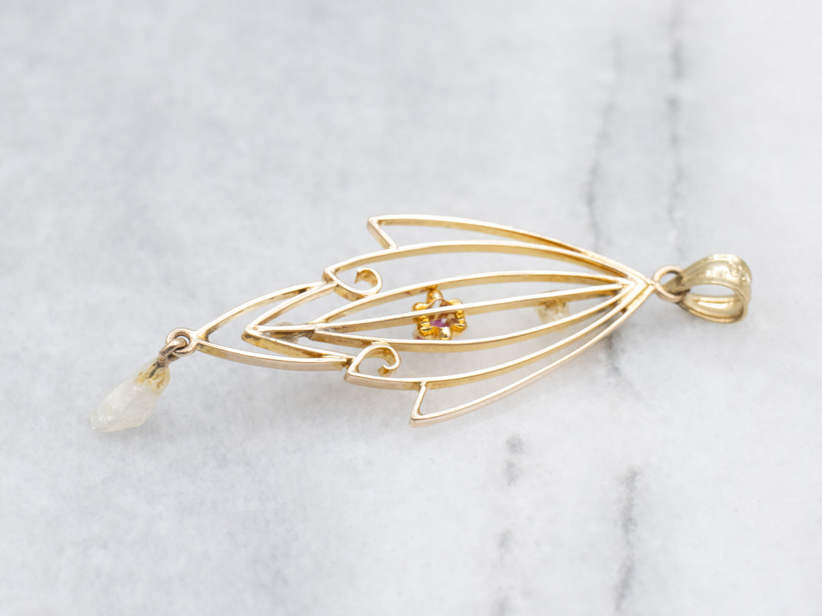 Absolutely incredible! This antique pendant was crafted in the early 1900s, with sweeping curves and a delicate seed pearl and a swinging freshwater pearl. A bright, round ruby sits at the center, its deep raspberry hue brought to light by the looping gold design!