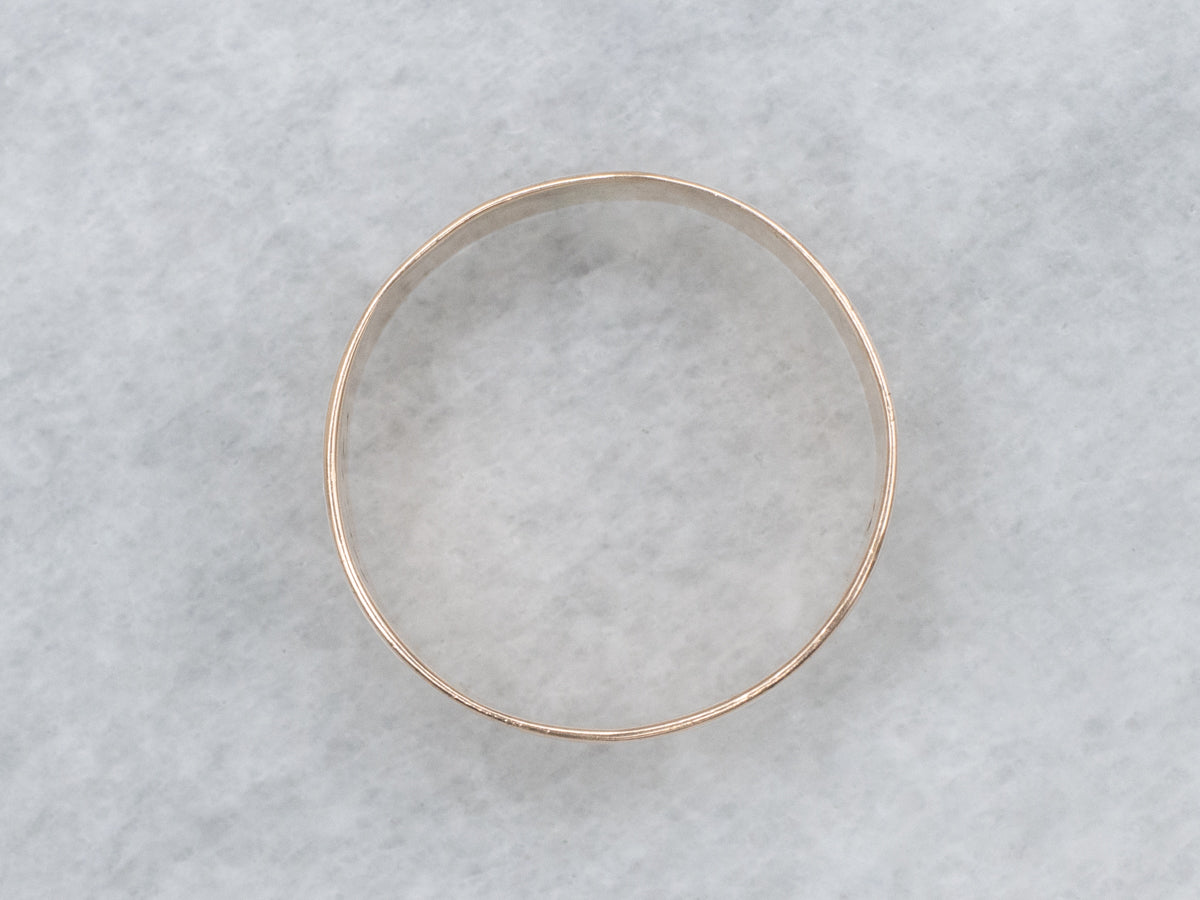 Simply polished edges are offset by a row of pink and green gold flowers on this antique wedding band from the Art Nouveau era. This low-to-the-hand, flat style of wedding ring is often called a Victorian Cigar Band, and is fast becoming a hard-to-find collectible!