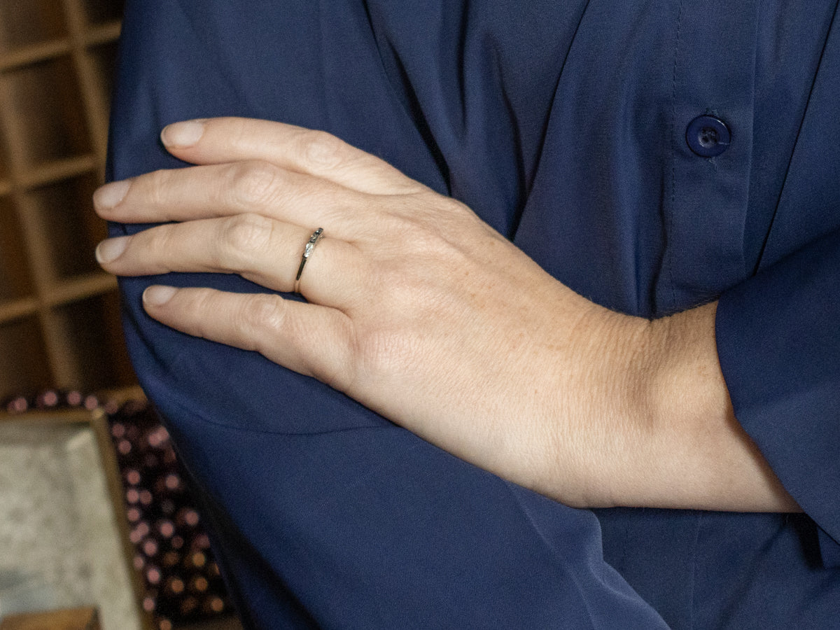 Metal: 14K White Gold Gem: 3 Diamonds totaling .20 Carats, H-I in Color, VVS-VS in Clarity Width of Band: 2.0 mm Height off Finger: 3.4 mm Ring Size: 5.75 Marks: "14K" Stamped on the inside band