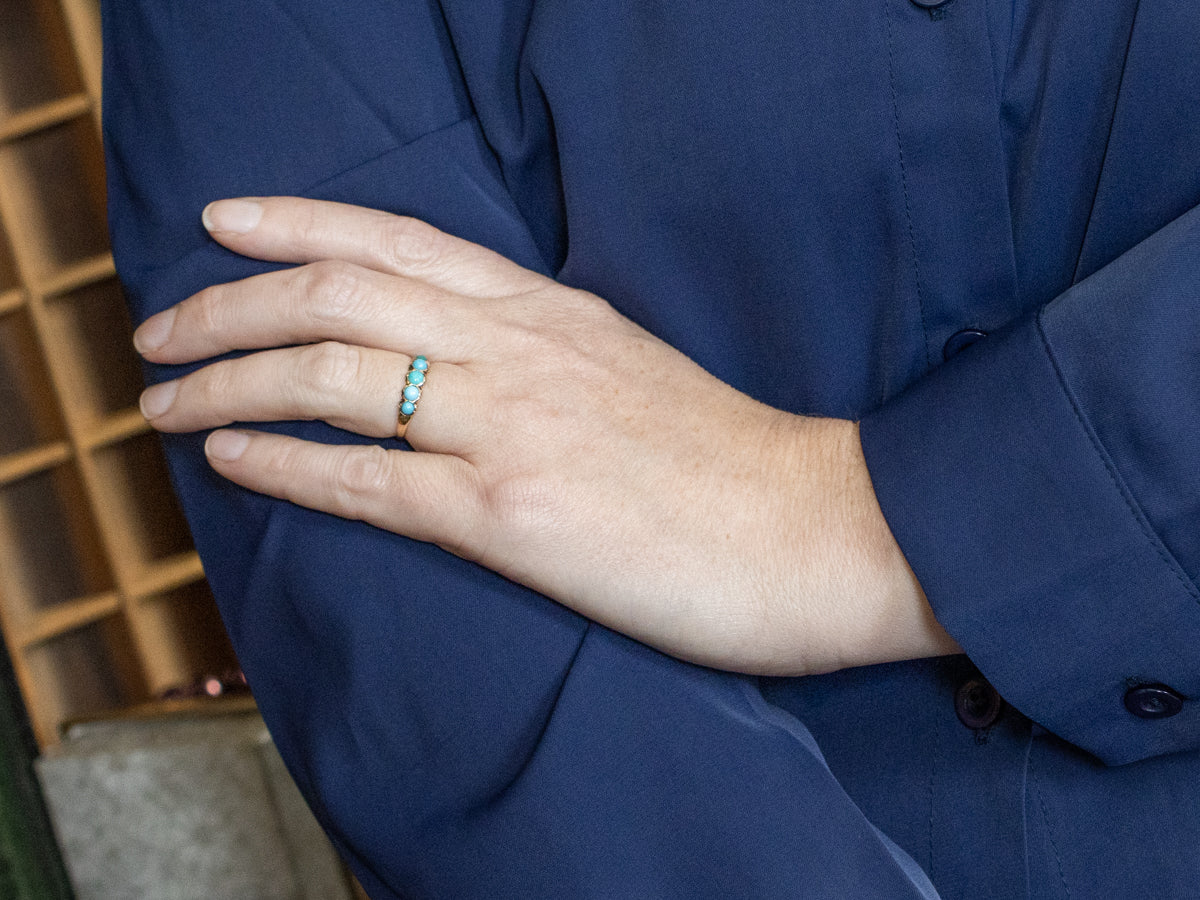 Believed to promote protection and strength, turquoise has a rich history. Dating back to Ancient Egypt, turquoise has been considered a sacred stone by many cultures. Native American cultures not only used turquoise for jewelry, but as ceremonial tokens and collateral. This ring features five round cut stones boasting saturated color, sure to impress onlookers!