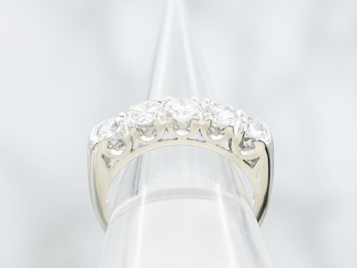 A sophisticated white gold band featuring five graduated diamonds that increase in size toward the center stone. This classic design showcases exceptional craftsmanship with each diamond carefully selected and set to create a seamless flow of brilliance. Perfect as a standalone statement piece or as a complementary band alongside an engagement ring, this timeless style combines elegance with versatile styling options.