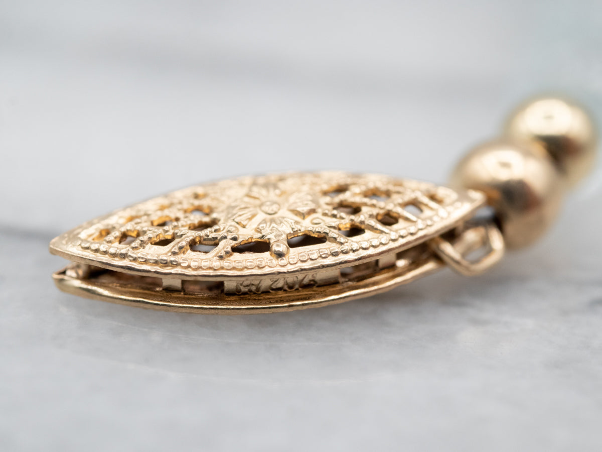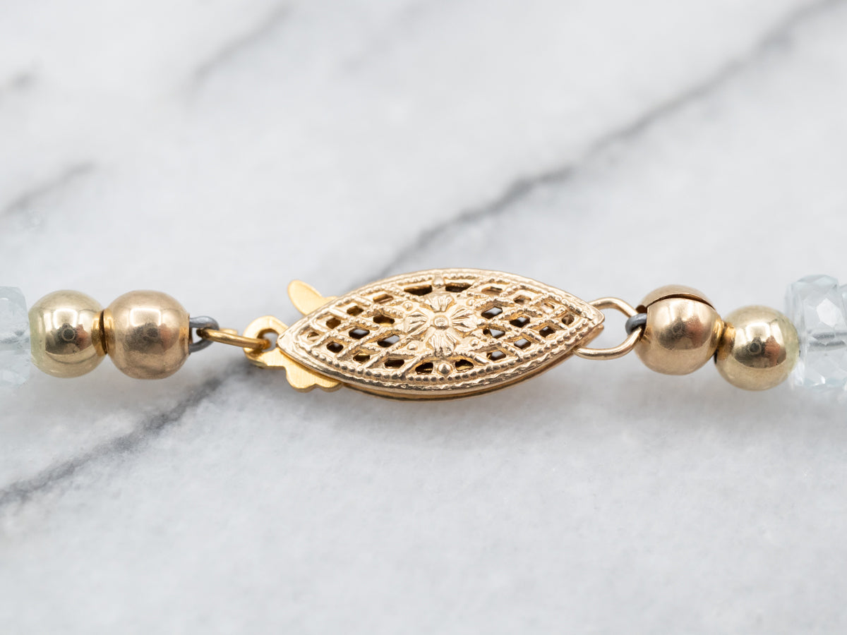 The graduated aquamarine beads on this necklace are beautiful! Flashes of icy baby blue sparkle throughout the gems. Substantial on its own, this necklace could also be layered with others.