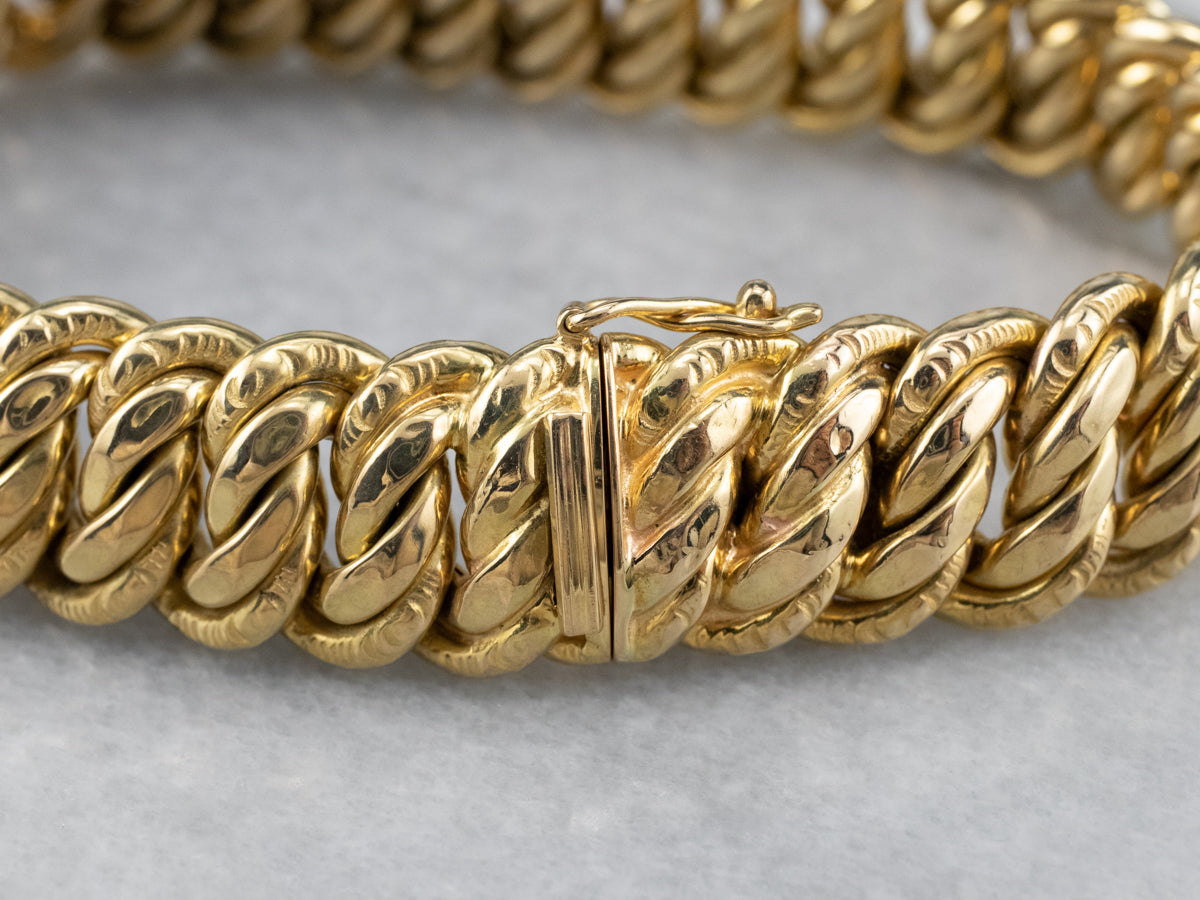 Polished and patterned links give this classic chain bracelet a feminine twist. The curb chain design allows this piece to lay comfortably on the wrist, and makes this bracelet perfect for layering with other pieces!