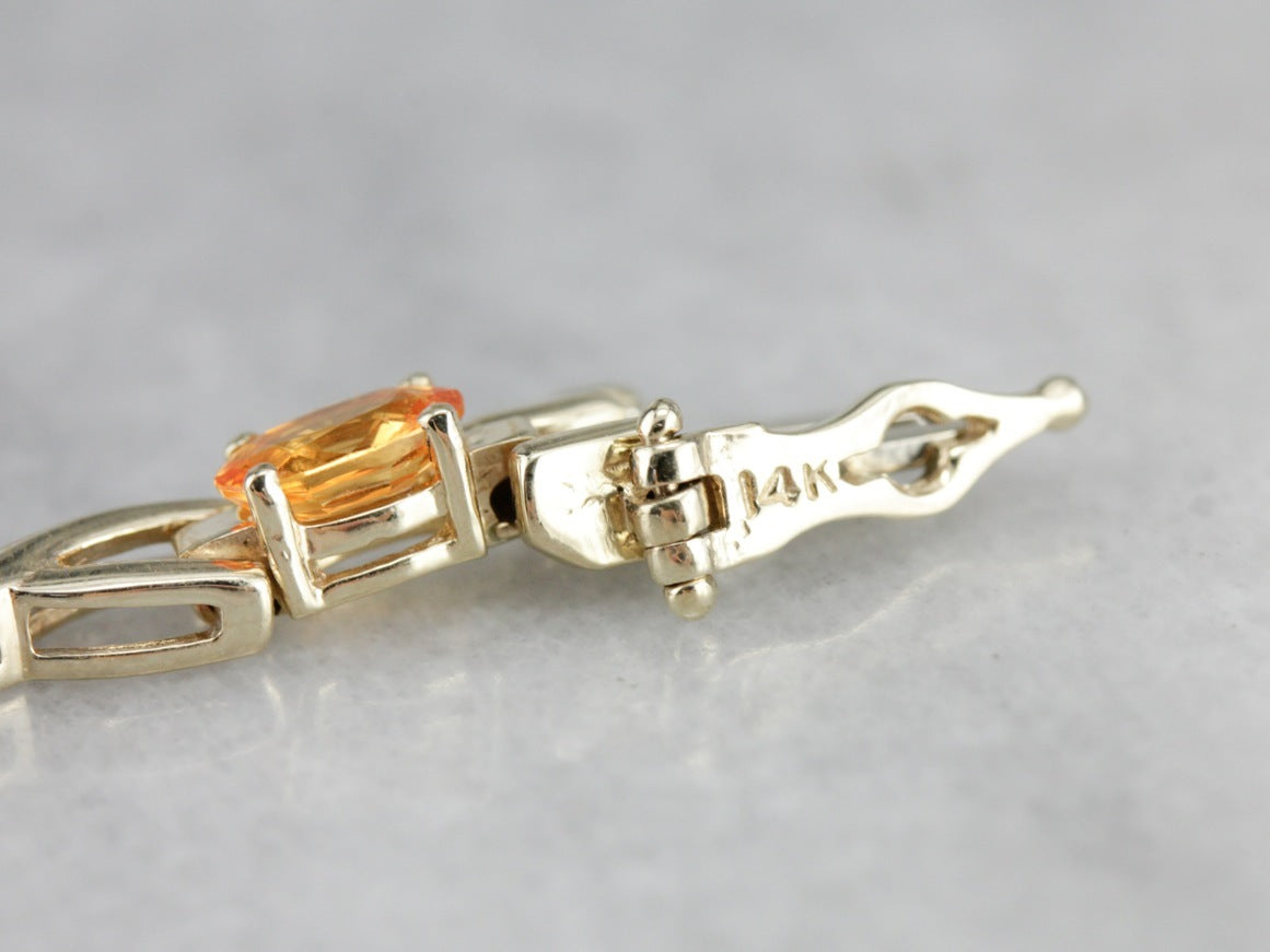 This is the definition of tennis bracelet! There is nothing here but stones, one long clean line of sapphires, each set in its own secure four prong mounting. The piece is flexible and fluid, with wonderful movement and light. The stones are well matched, laid out in a rainbow of color!