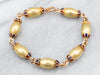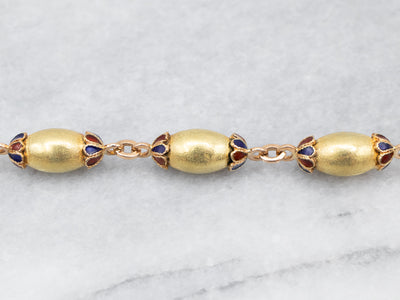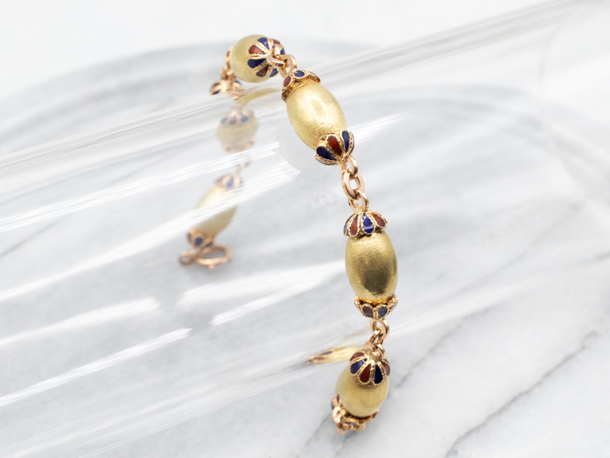 This unique vintage bracelet is crafted out of yellow gold and features an enamel design for added style and structure. A reliable spring ring clasp will ensure your bracelet stays secure all day. Elevate any look with this beautiful and timeless piece of jewelry.