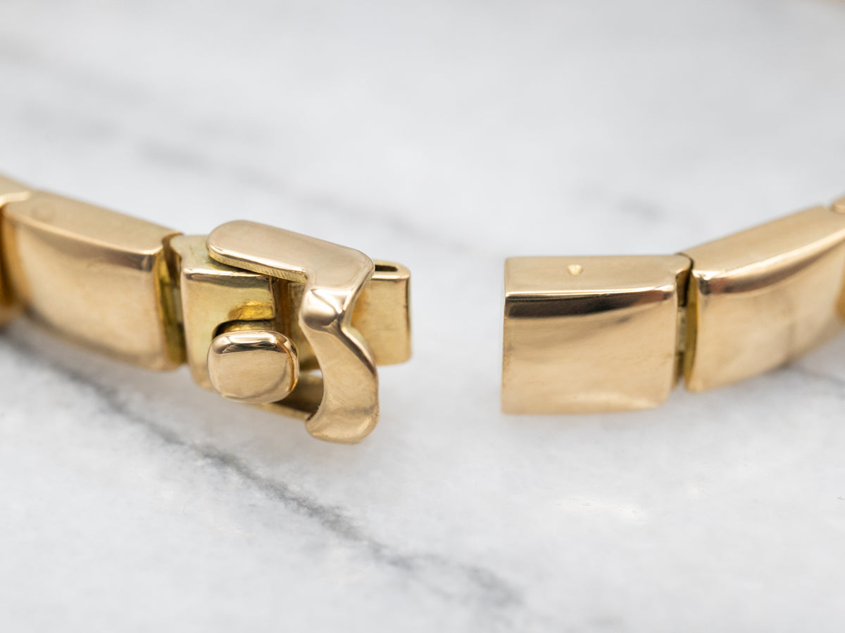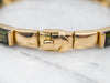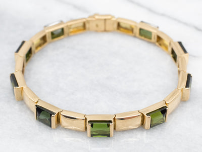 This elegant yellow gold bracelet showcases green tourmaline gemstones. Crafted from solid yellow 18-karat gold, it is timeless and will be sure to become a treasured accessory. The green tourmaline stones offer the perfect combination of sophistication and style.