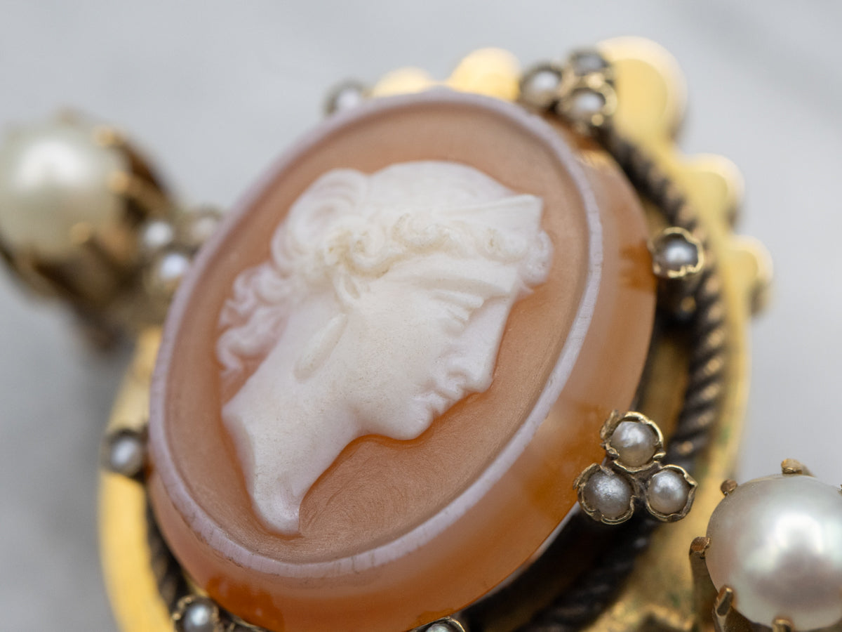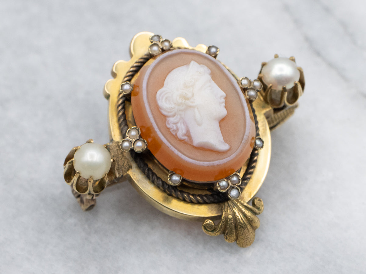 This antique brooch has a bright yellow glow and plenty of light reflected in the royal design. The cameo itself has similar tones, carved of sardonyx with a pink tint; the figure at the center is creamy white and very detailed! Creamy pearls in individual prong set mountings bring class and sophistication to this vintage piece.