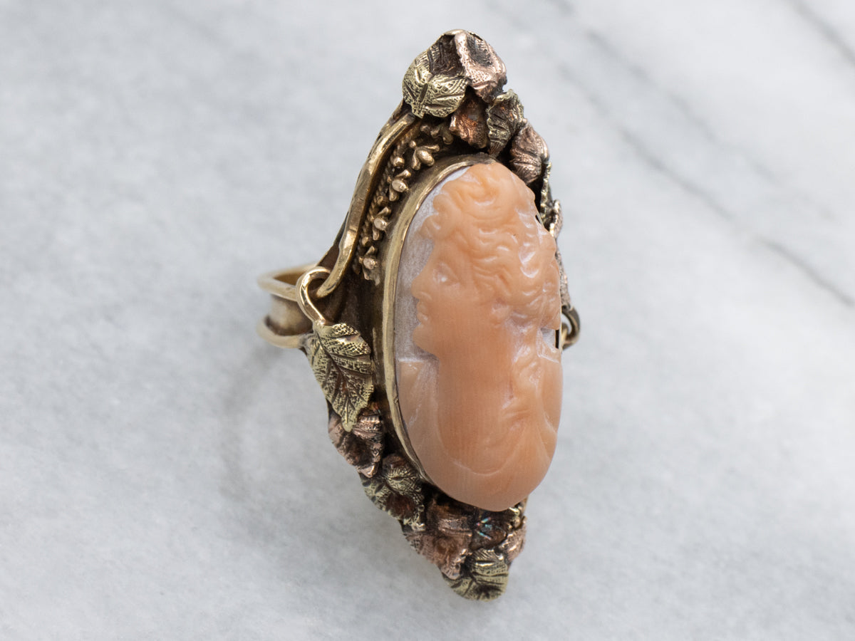 Metal: 14K Rose, Green and Yellow Gold Gem: Coral Cameo Gem Measurements: 11.2 x 20.75 mm, Oval Ring Size: 6 Marks: "14K" Stamped