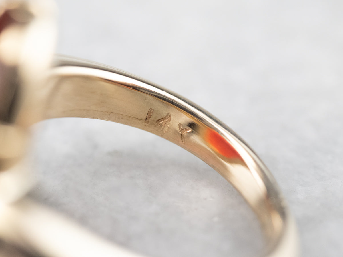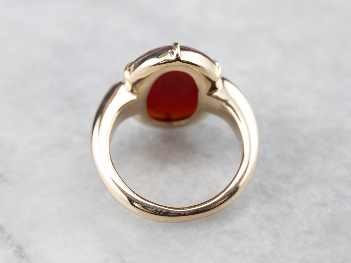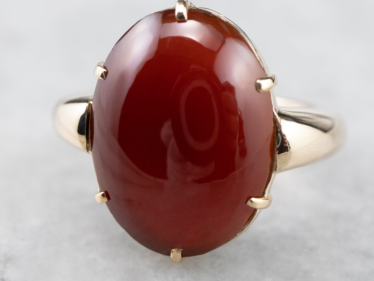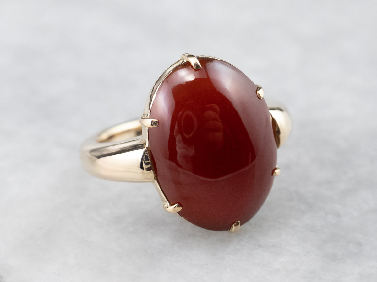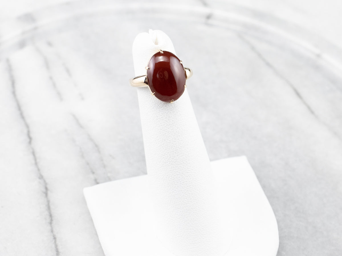 So sweet, simple, and stylish! Particularly nice on this antique early 1900s piece is the way the stone is set. Claw like prongs grips the cabochon securely in the center, a beautiful carnelian cabochon of deep mahogany tone, timeless and stunning!
