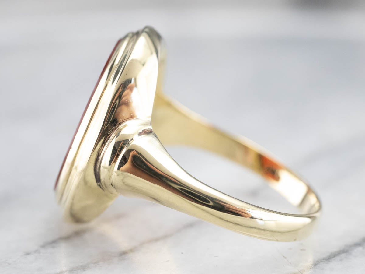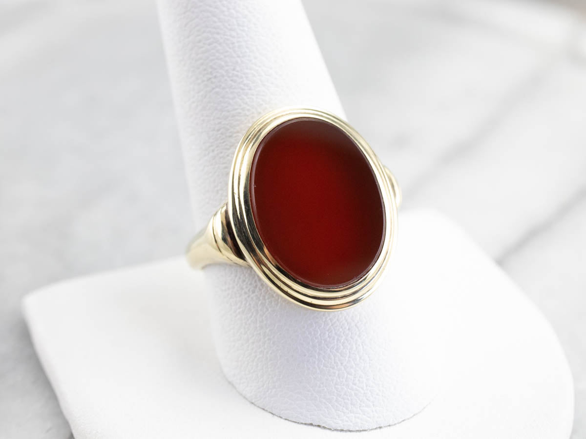 This is a vintage piece from the early 1940s, and the popular style continues to be a favorite decades later. The center of this vintage ring is set with a deep, orange-red carnelian. The sleek polished shoulders give the piece a timeless design, both modern and classic all at once!