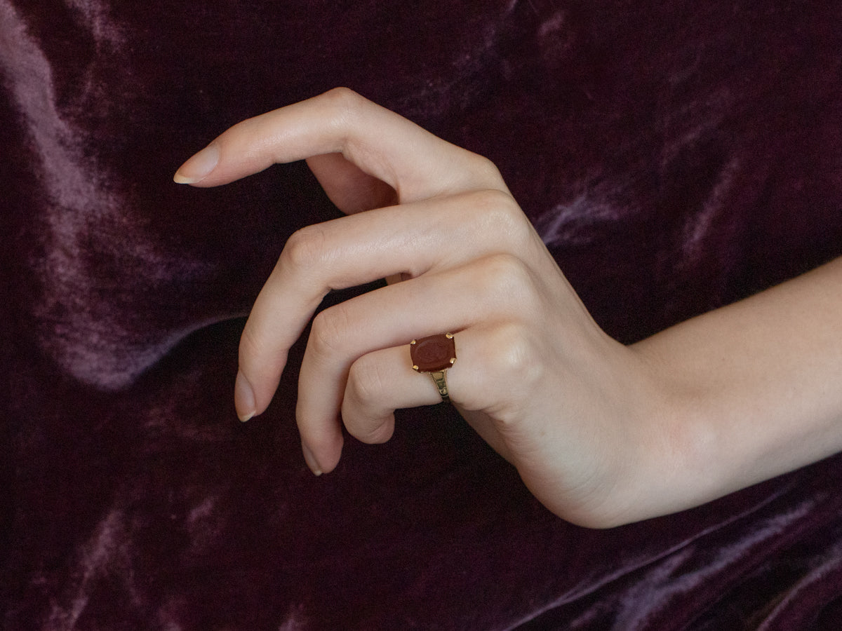 This vintage cameo ring is simple, yet beautiful! The cameo is carved out of russet red carnelian and depicts a classical Roman woman in profile. A minimalist setting of 10 karat gold is the perfect compliment to this striking stone.