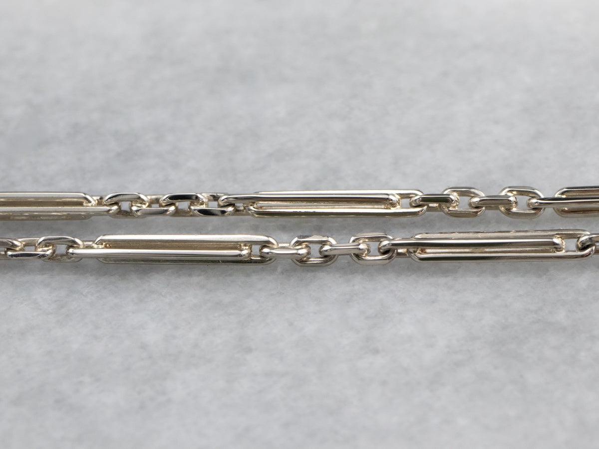 This Art Deco era watch chain features sleek elongated bars and small, well-balanced links. With a simple polish and classic design, this is ready to wear or give as a gift, it also would make a lovely component for a custom necklace as well!