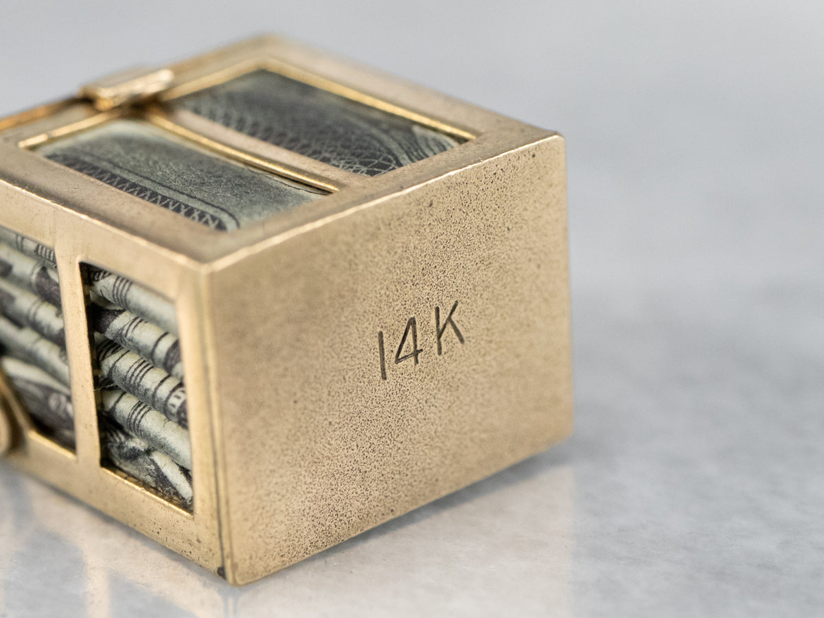 This quirky charm is wonderfully crafted! Solid gold reading "In Emergency Break Glass" and "Mad Money" with glass and a dollar bill inside, this fantastic, detailed pendant is ready to wear or give as a great funny gift!
