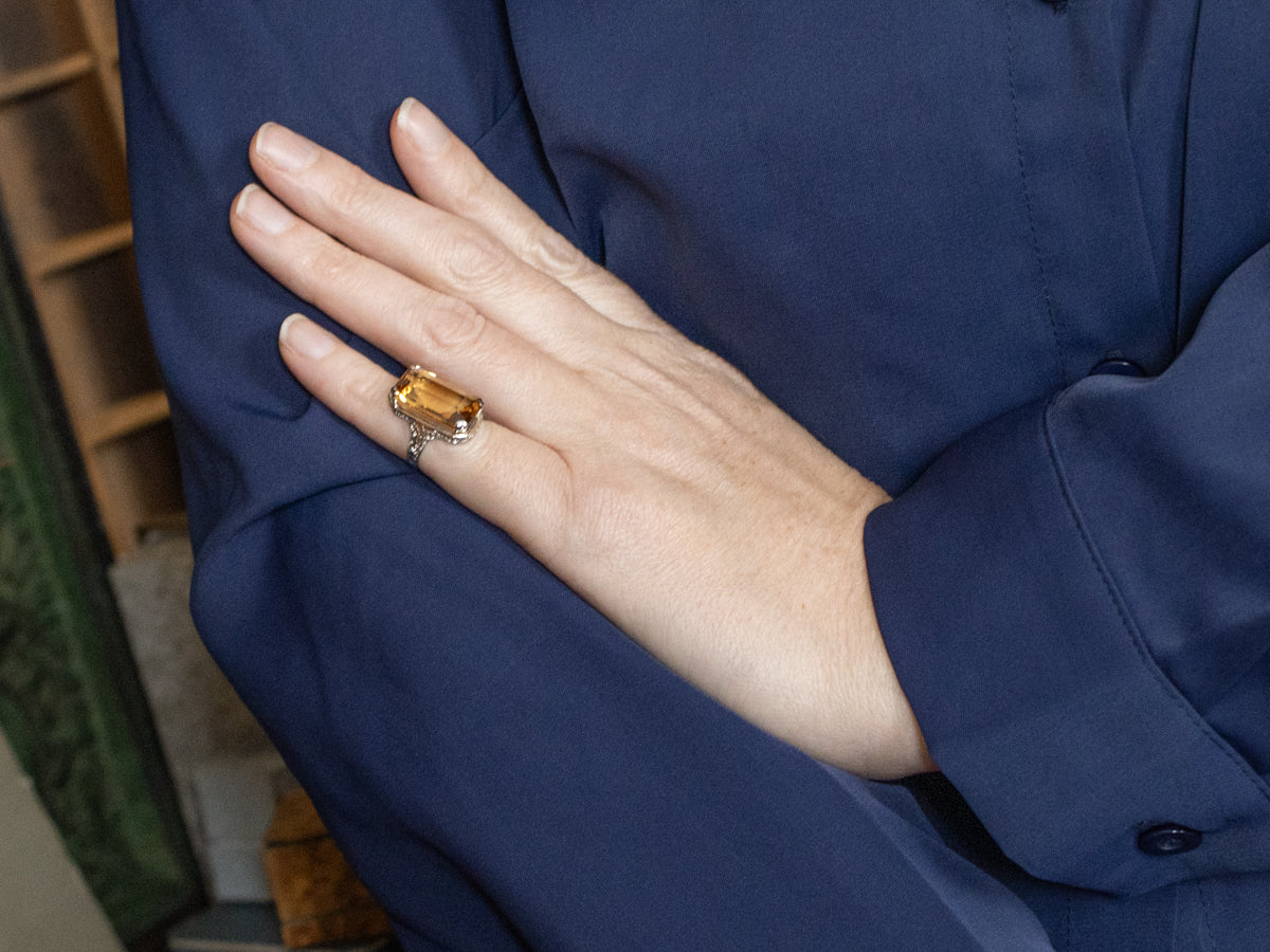 This beautiful Art Deco filigree mounting is wonderfully wrought with tiny details and sweetly scrolling cut-outs. We've set this antique gold setting with an elongated cushion-cut citrine gemstone. The sunny golden tones of the deeply saturated citrine gemstone perfectly complement the lustrous, polished white gold, creating a captivating and luxurious look!