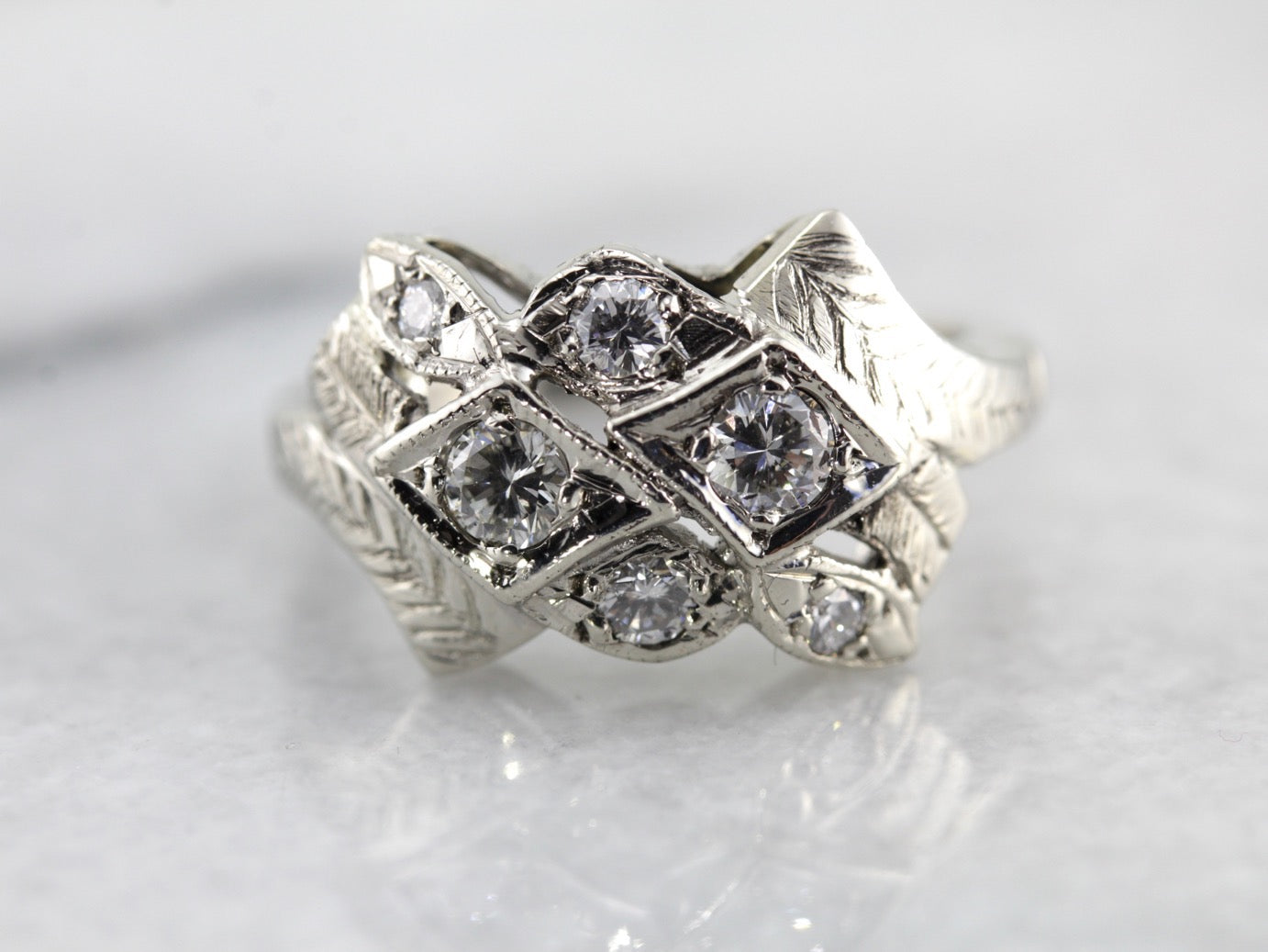This fabulous vintage ring will serve well for day or night, as a cocktail ring or a fantastic right hand piece! This dates to the Retro Era period, and it features the geometric lines indicative to that era. Crafted of white gold the better to accent the diamonds, this piece is comfortable on the hand and easy to wear for any occasion!