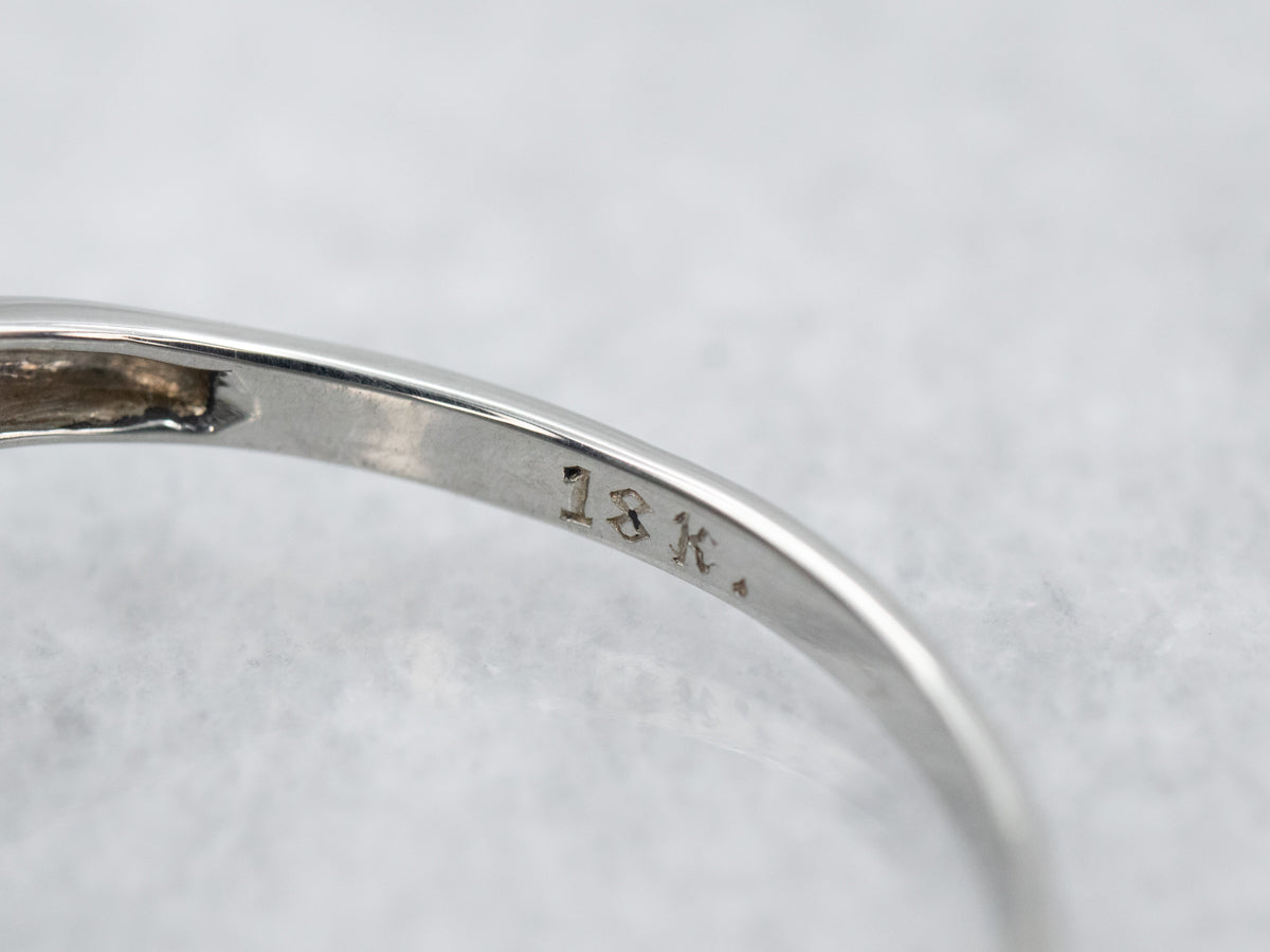 Metal: 18K White Gold Gem: Diamond .03 Carats, VVS in Clarity, G in Color Gem Measurements: 2.3 mm, Round Accents: 2 Diamonds totaling .01 Carats, VVS in Clarity, G in Color Ring Size: 6 Marks: “18K” Stamped on the inside band