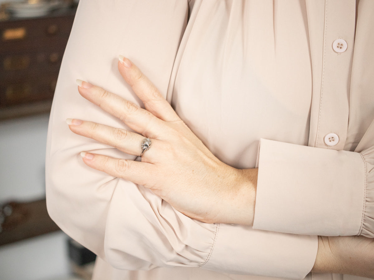 Straight from the Art Deco era, this handsome ring has an industrial flair! This is not only decorative but provides maximum security around the center diamond. Open cut-outs let in tons of light, and the ring is finished off with a simple flat-diamond beveled design on the band.
