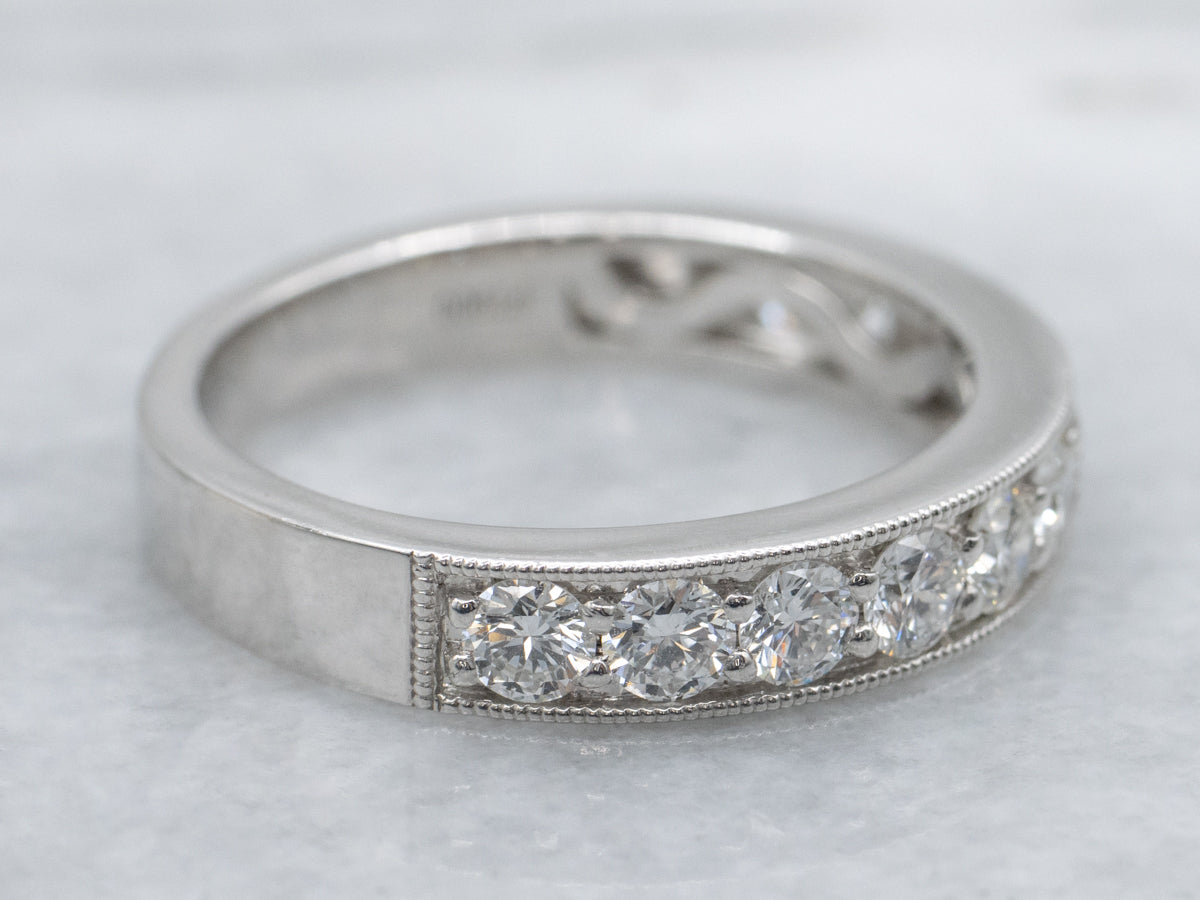 Metal: Platinum Gem: 11 Diamonds totaling .97 Carats, G-H in Color, VS-SI in Clarity Width of Band: 3.9 mm Height off Finger: 2.7 mm Ring Size: 7.25 Marks: "PT900 HCH D097" Stamped on the inside band