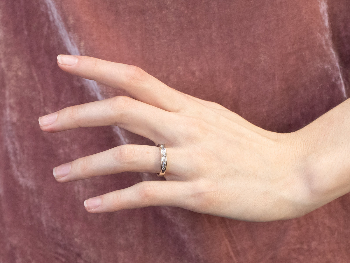 This diamond band has the look of an eternity ring when worn, but can easily be resized if needed. Soft on the inside, highly polished on the outside, this is a great piece to use as a stacking band, with bright glittering diamonds inlaid along the top!