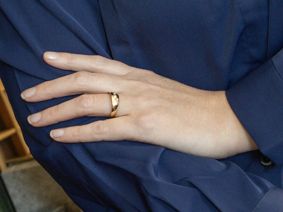 Metal: 14K Yellow Gold Gem: 5 Diamonds totaling .25 Carats, G-H in Color, I in Clarity Width of Band: 6.9 mm Height off Finger: 1.6 mm Ring Size: 10.50 Marks: "14K RAD" Stamped on the inside band