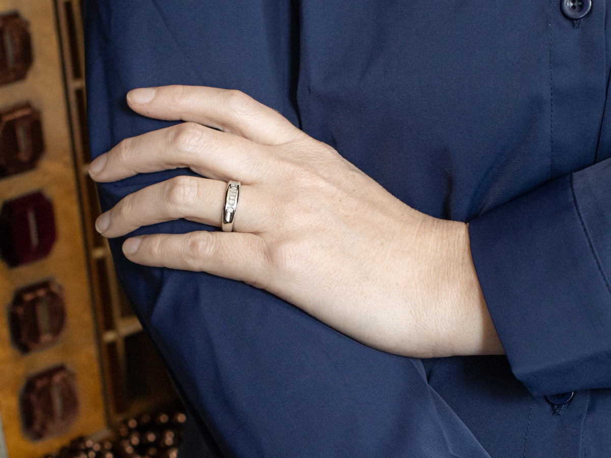 This gorgeous platinum band is set with a glittering row of baguette-cut diamonds. Channel settings never go out of style! The effect of one long row of diamonds, one band of glittering bright light, across the finger is always popular and always lovely. The sides of the ring completely encase the diamonds, keeping them safe and secure, which makes these rings easy to wear every day!