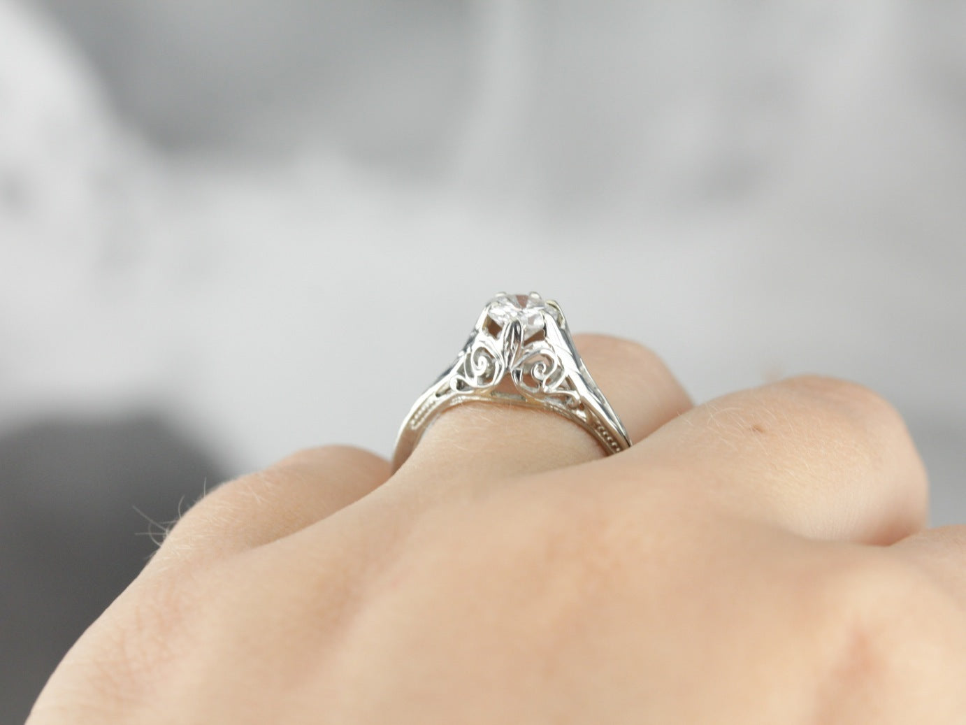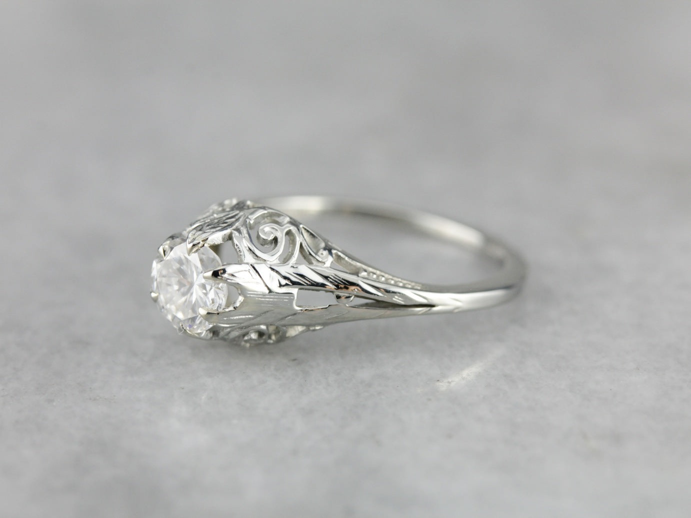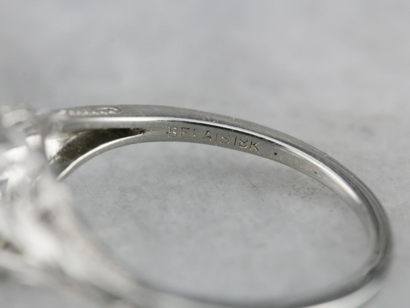 Belais jewelry is highly collectible & sought after, because their company is considered to be one of the first to use white gold in the U.S. This exquisite Belais engagement ring, crafted in the traditional Art Deco style is in magnificent condition. High atop the curling white gold filigree is a fabulous diamond, the perfect centerpiece.