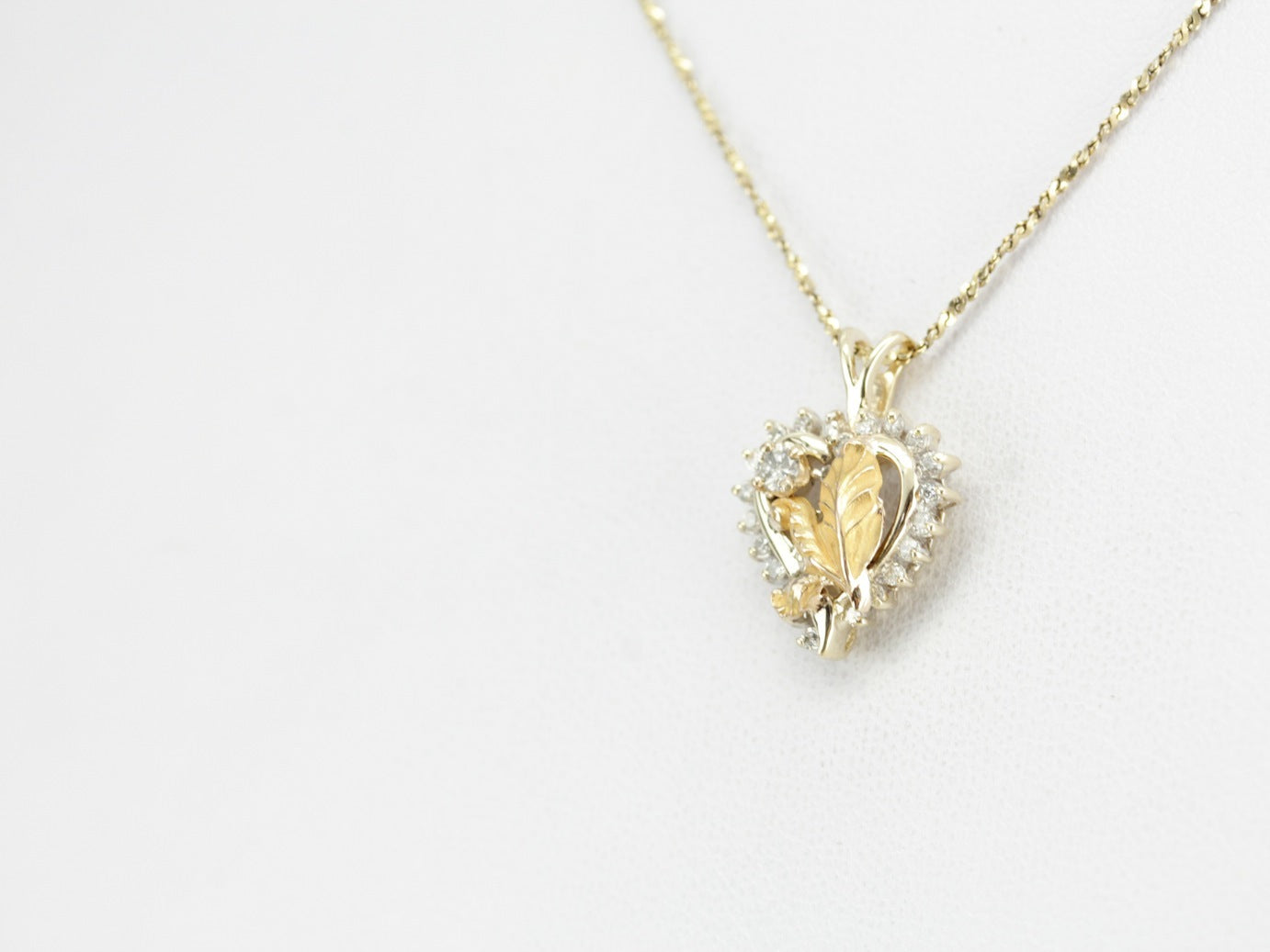 A sweet Victorian leaf is given new life in this one of a kind pendant! We've set this gorgeous little gold piece on to a new frame. The diamond behind the leaf contrast the soft hue of the gold to perfection!