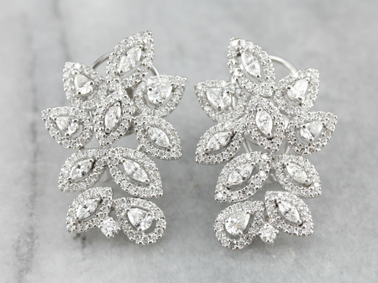 These vintage cocktail earrings are beautifully crafted, substantial and luxurious in style! Bright white gold forms a gleaming frame for the outstanding diamonds that form a glittering motif, sure to be an heirloom piece for years to come!
