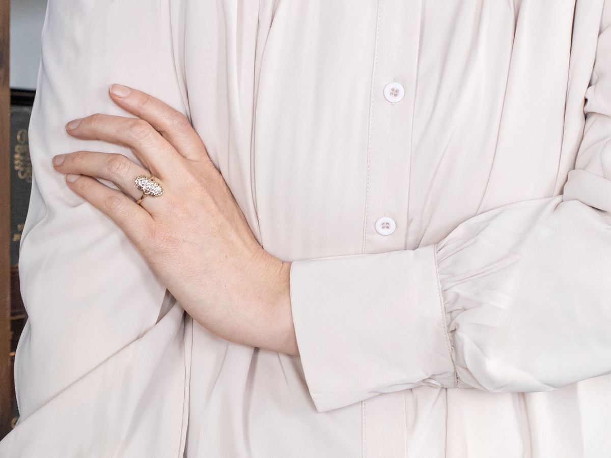 This fantastic dinner ring is crafted of lacey, yellow gold filigree with immaculate details. The center of the ring is set with sparkling champagne-hued diamonds in a placard of white gold, the better to shape and frame the round diamond that glitters under the prongs!