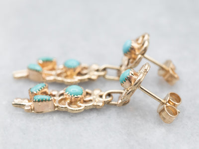 Metal: 10K Yellow Gold Gem: 8 Turquoise Gem Measurements: 3.3 mm, Round Earrings Length: 30 mm Earrings Width: 8 mm Marks: “FMP” Stamped on the Findings