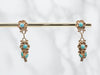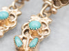 These are hand-made drops with a big impact! Set with bright teal blue turquoise gemstones accent the warmth of the floral yellow gold motifs. Perfect for day-to-day wear, this would make a lovely gift!