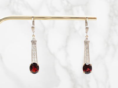 These eye-catching earrings are the perfect way to make a subtle but bold statement. Crafted with an elegant mix of yellow and white gold, the intricate filigree design holds two vibrant and deep garnet stones. Their unique drop design make them the perfect accessory for any outfit.