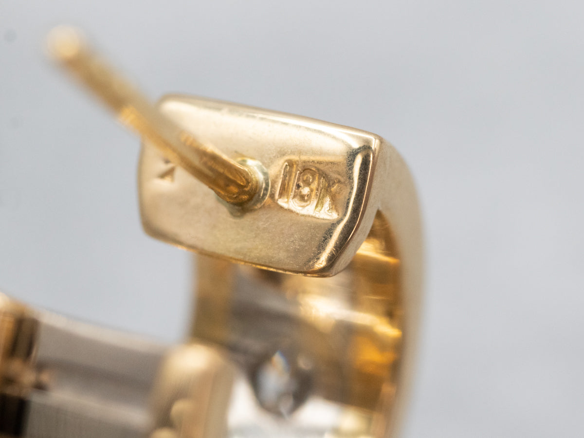 Metal: 18K Yellow and White Gold Gem: 2 Diamonds totaling .24 Carats, VS in Clarity, F in Color Gem Measurements: 3.3 mm, Round Earrings Length: 14.3 mm Earrings Width: 7.0 mm Marks: "18K" Stamped on the Findings