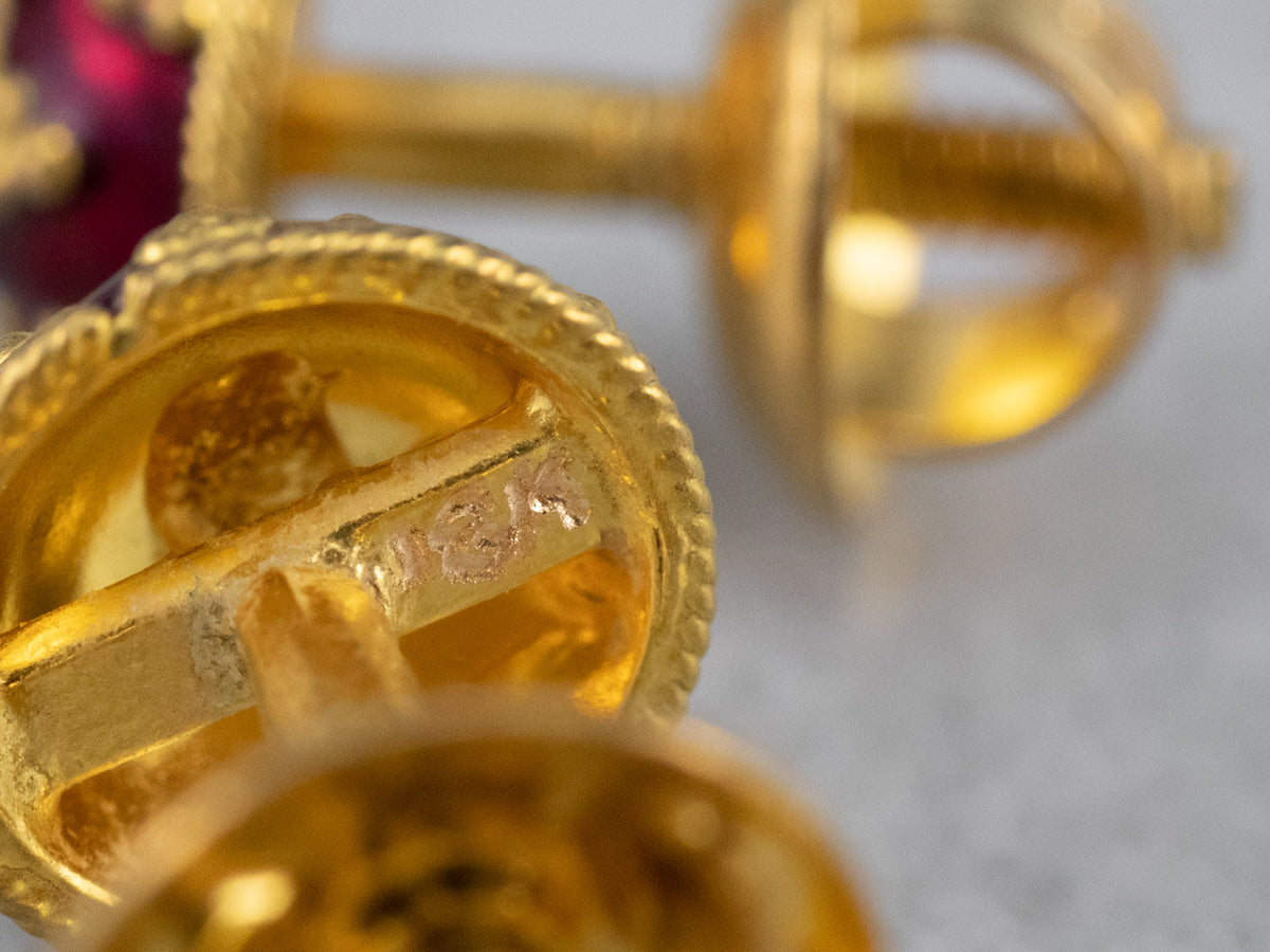 These earrings strike the perfect balance of bold and feminine! Polished yellow gold balls are finished with bright lacquer red and white enamel in a simple motif. These screw-back stud earrings are perfect for a day in the office or a night on the town!