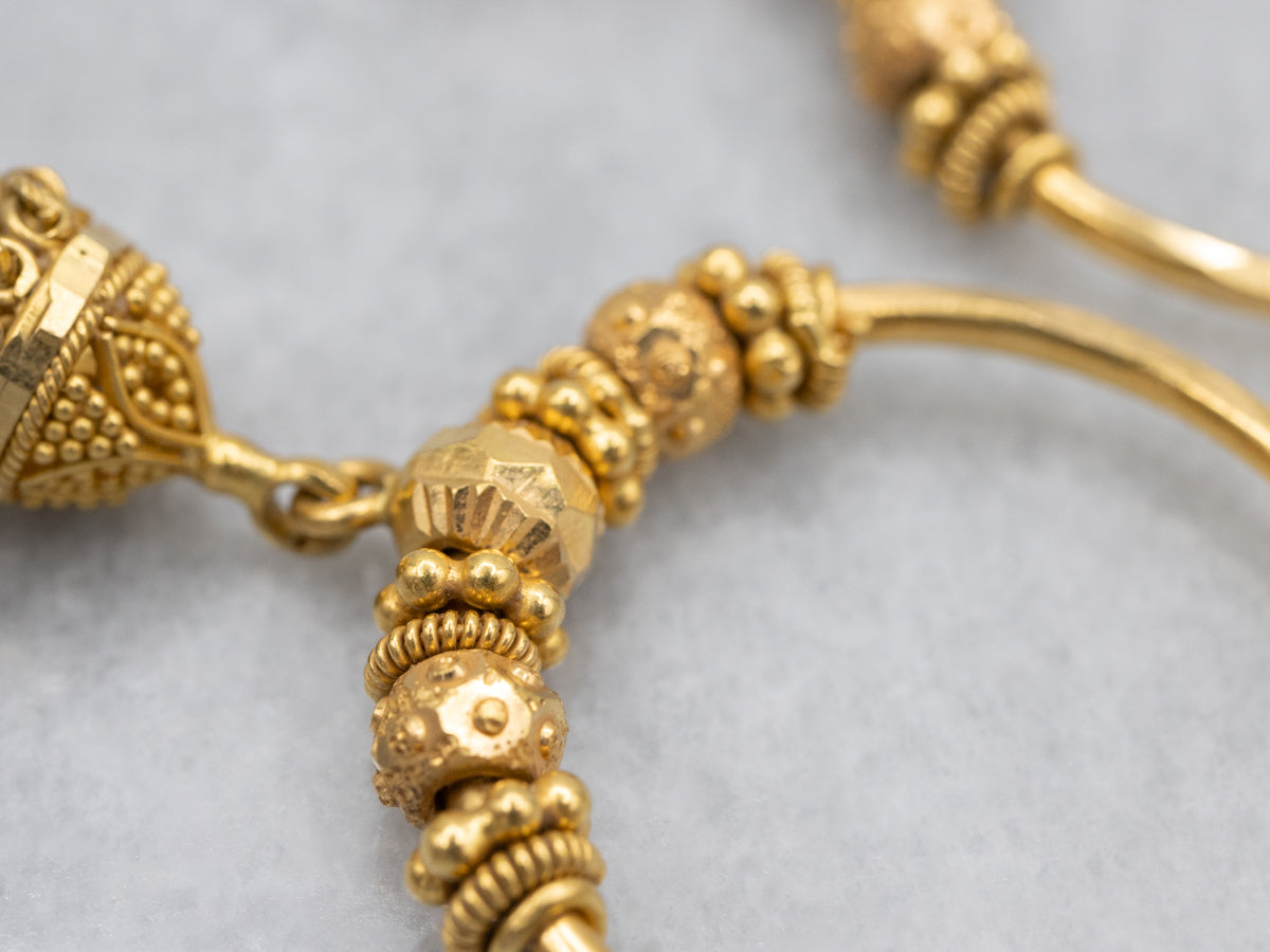These substantial, intricate 22-karat gold earrings have an ancient feel to them. The design is exquisitely worked, reminiscent of Etruscan jewelry from the Victorian Era. The milligrain finish is a lovely texture, while the beaded drops give them a sense of motion in the ear.